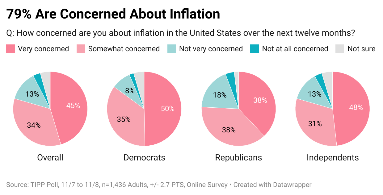The survey showed that 79% are worried about inflation. One-half (45%) are very concerned, and another 34% are somewhat concerned.