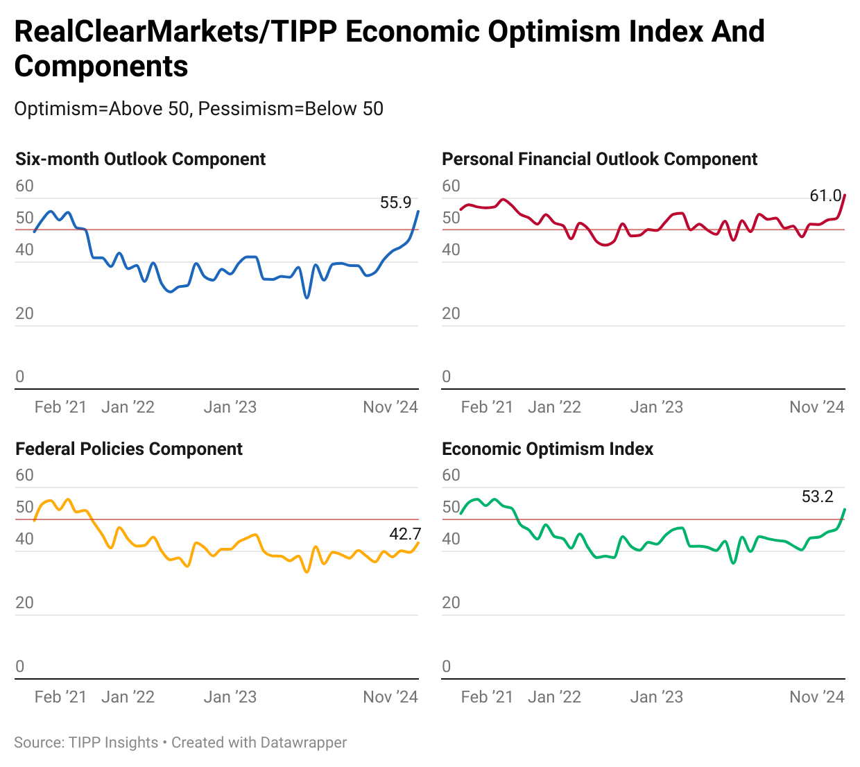 The RCM/TIPP Economic Optimism Index is the first monthly measure of consumer confidence. It has established a strong track record of foreshadowing the confidence indicators issued later each month by the University of Michigan and The Conference Board. (From February 2001 to October 2023, TIPP released this Index monthly in collaboration with its former sponsor and media partner, Investor's Business Daily.)