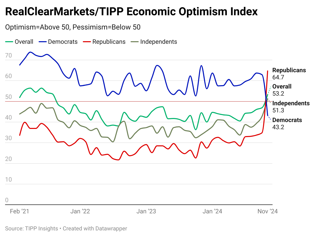 The RealClearMarkets/TIPP Economic Optimism Index, a leading gauge of consumer sentiment, rose by 13.4% in November to 53.2, reaching its highest level since August 2021 (previous high: 53.6). The Index had been in negative territory for 38 consecutive months, starting in September 2021, and broke out decisively in November after Donald Trump's historic return as the 47th President. November’s reading of 53.2 is 8.3% higher than its historical average 49.1.