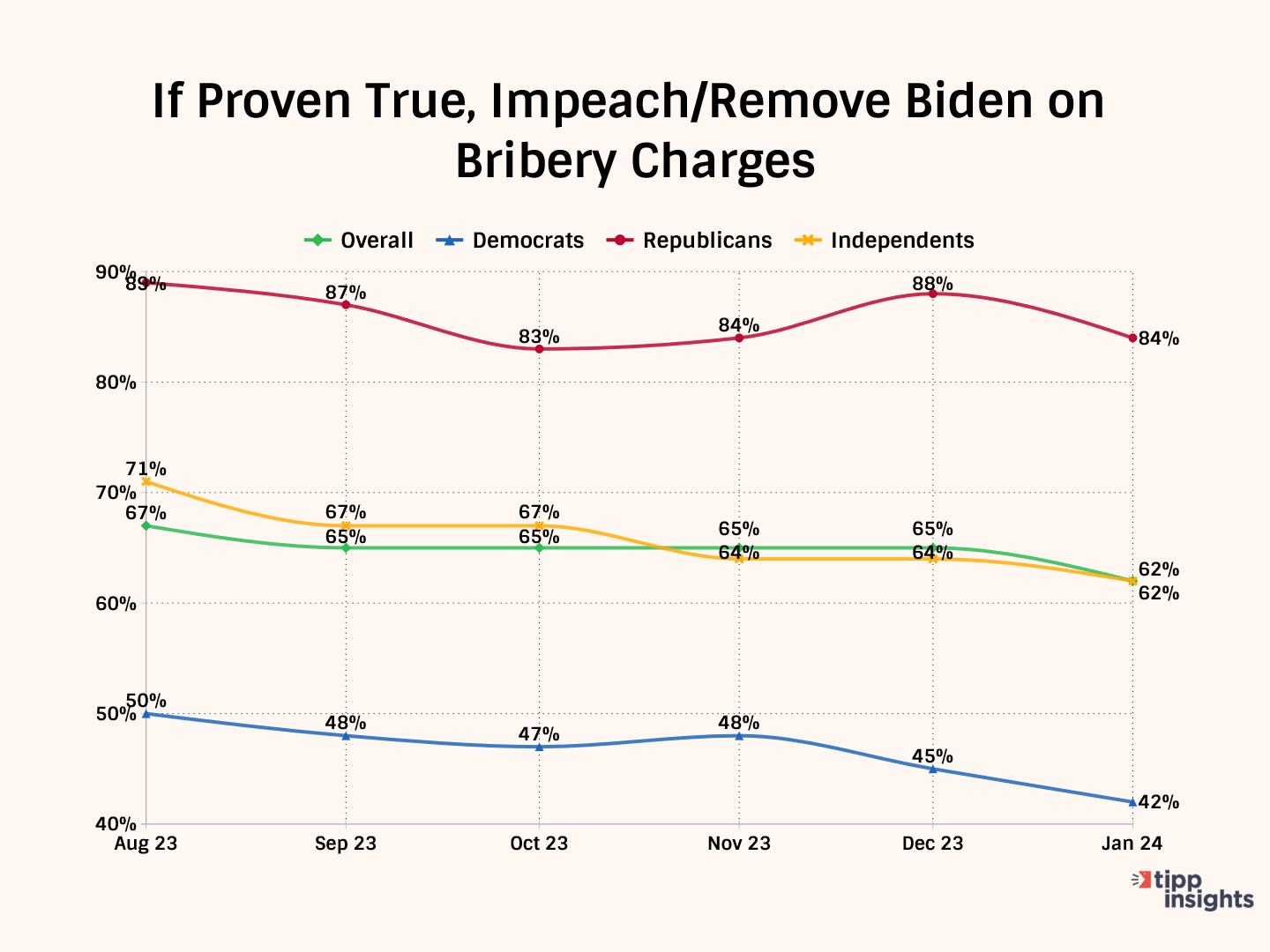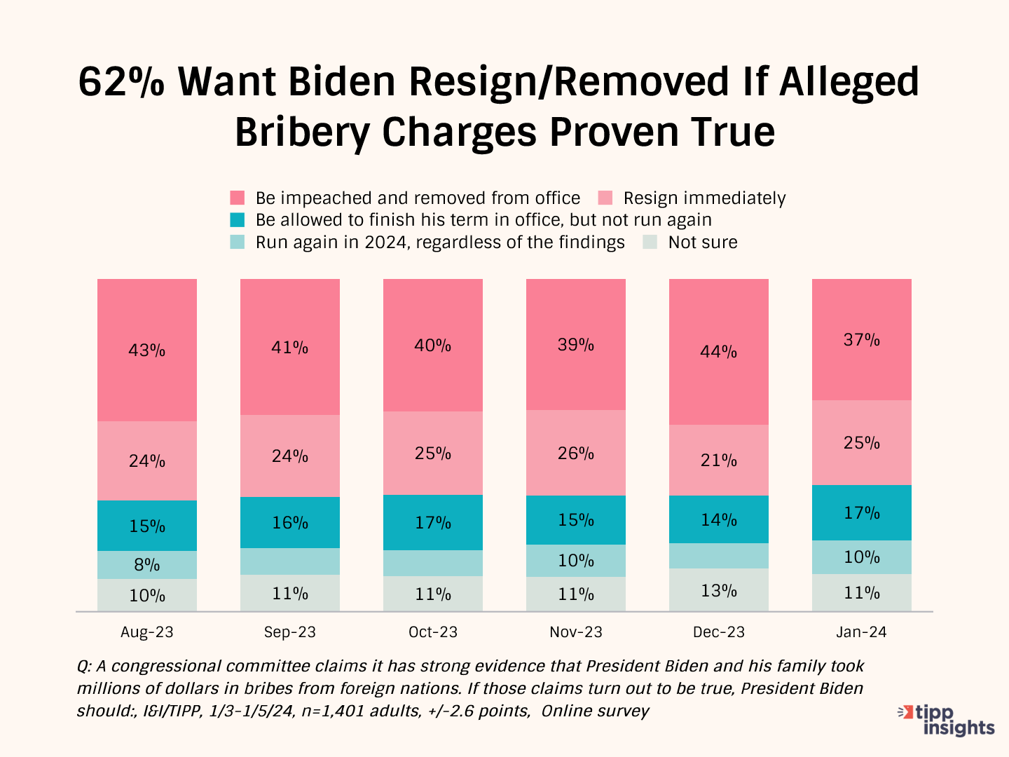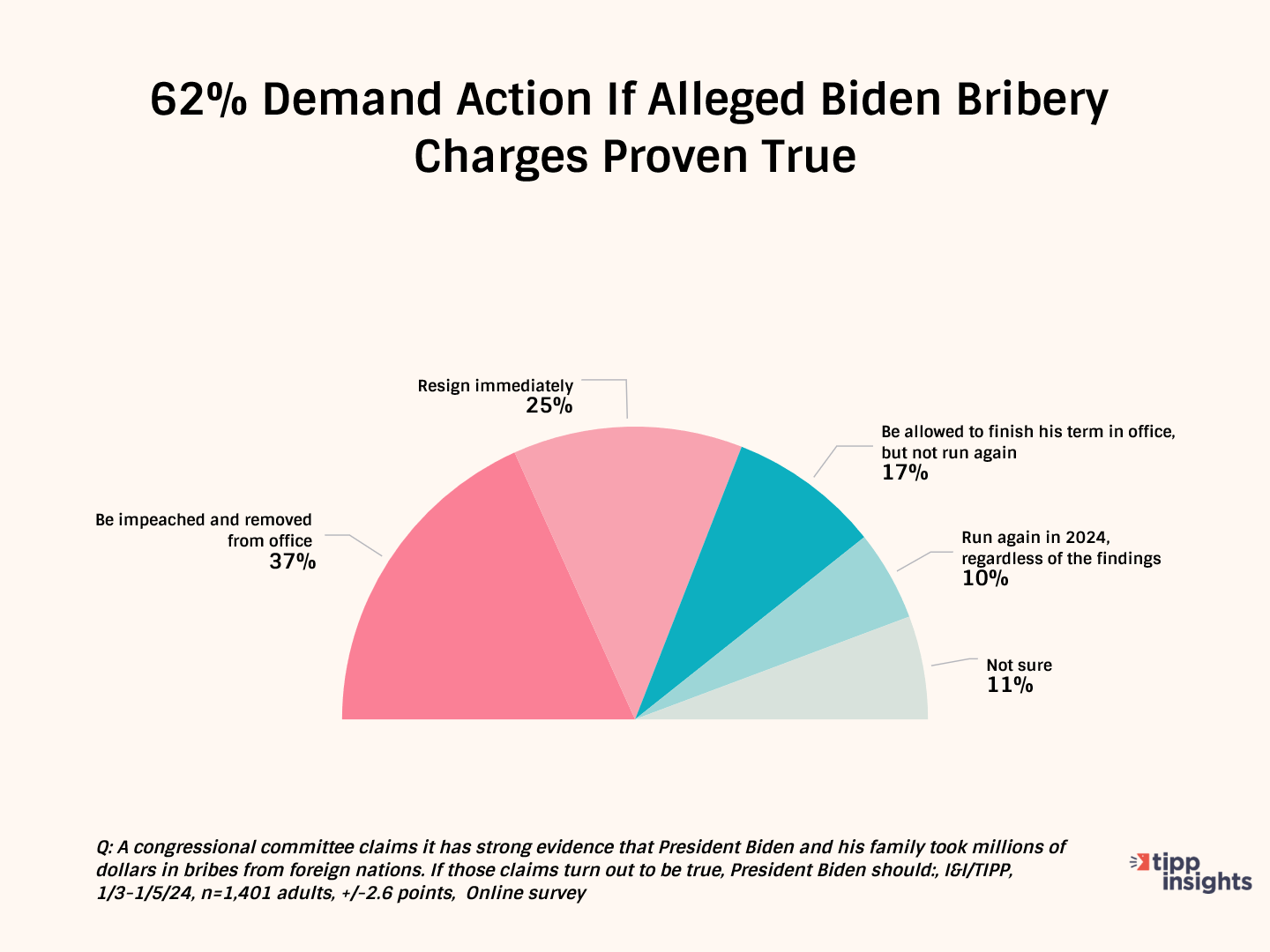 As of January 2024, 62% say Biden should either resign (25%) or be impeached (37%) for his misdeeds, with a plurality of Democrats (42%) and strong majorities of Republicans (84%) and independents (62%) agreeing.