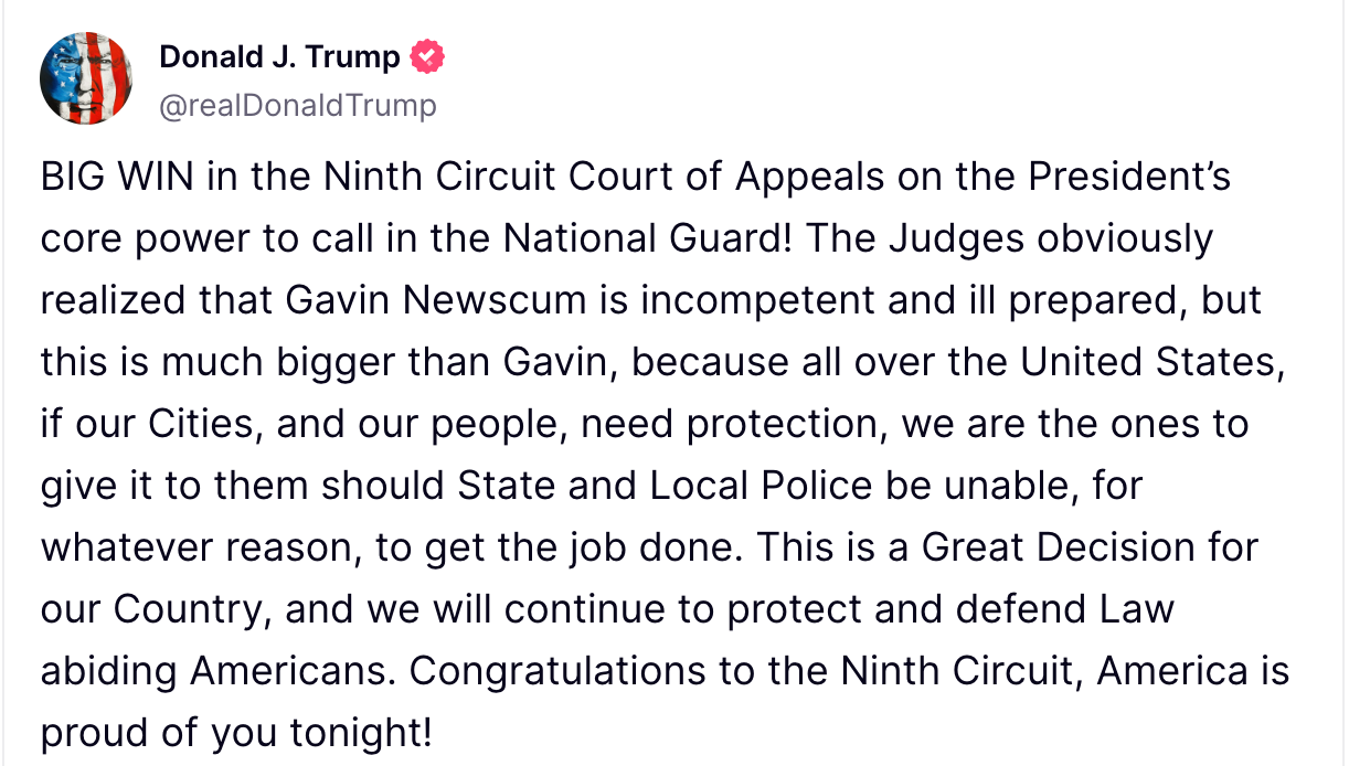 The legal challenge from Newsom, who argues Trump’s deployment was unlawful and authoritarian, will continue. Newsom vowed on X to keep fighting: “The president is not a king and is not above the law.”