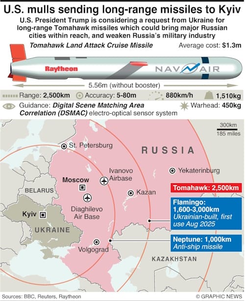 President Trump is considering a request from Ukraine for long-range Tomahawk missiles which could bring major Russian cities within reach and weaken Russia’s military industry.