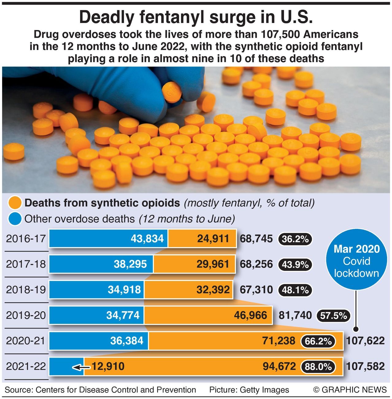 Drug overdoses took the lives of more than 107,500 Americans in the 12 months to June 2022, with the synthetic opioid fentanyl playing a role in almost nine in 10 of these deaths.