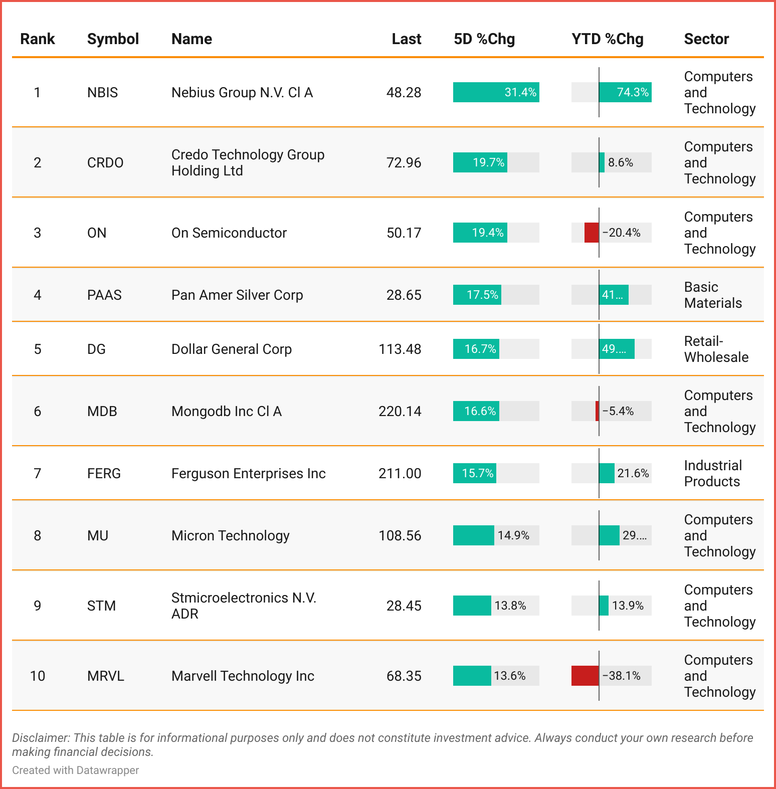 Tickers: NBIS| CRDO | ON | PAAS | DG | MDB| FERG | MU | STM | MRVL