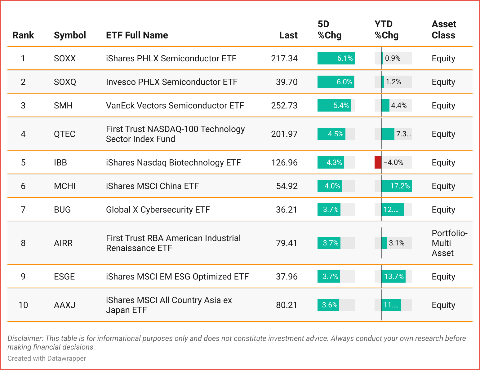 Tickers: SOXX | SOXQ | SMM | QTEC | IBB | MCHI | BUG | AIRR |ESGE | AAXJ