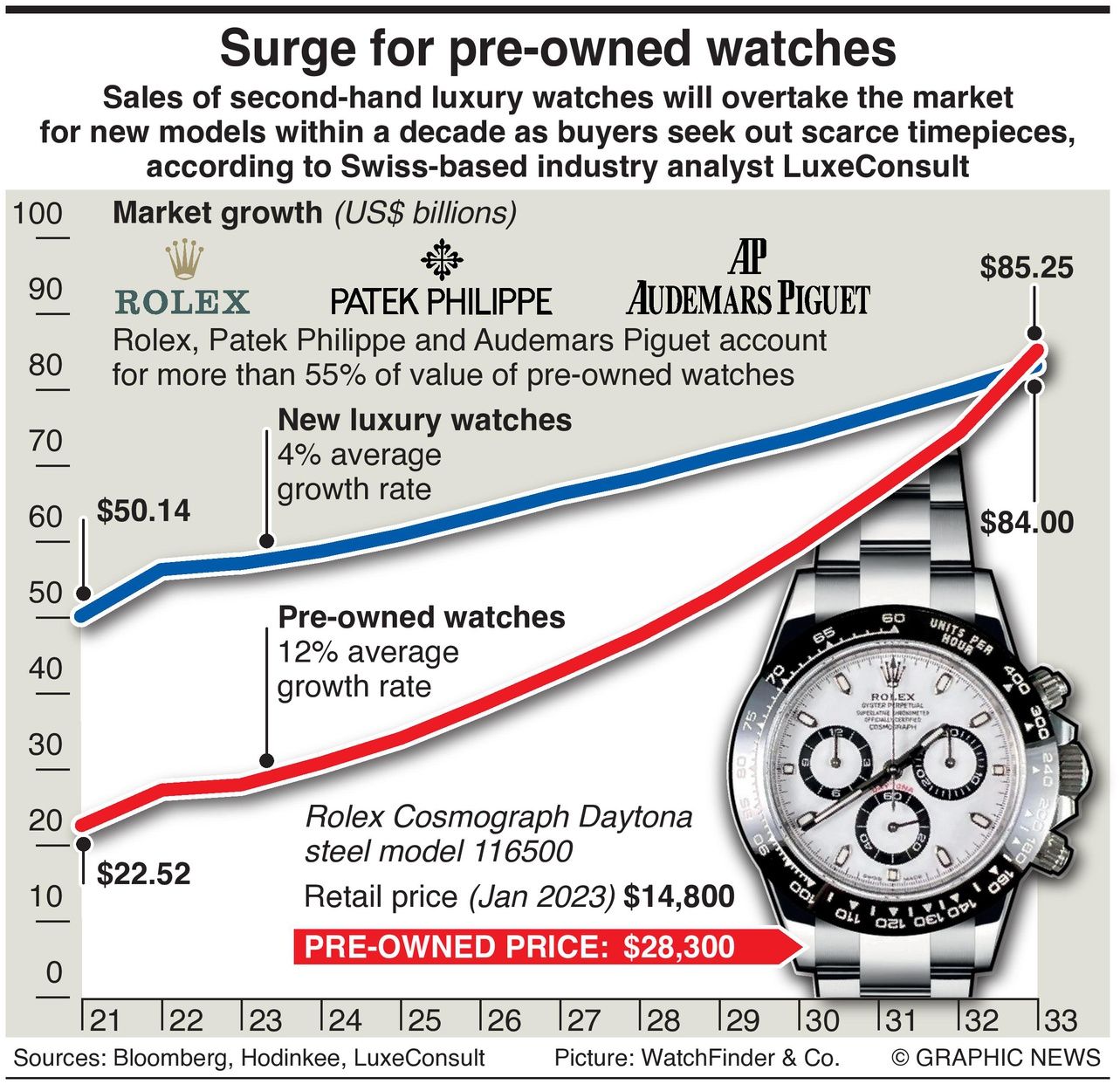 LuxeConsult expects secondary market sales to rise just three percent in 2023 and 10 percent in 2024 before averaging a 12 percent annual growth rate from 2025 until 2033. That’s compared to an average 4% growth rate in sales of new luxury watches.