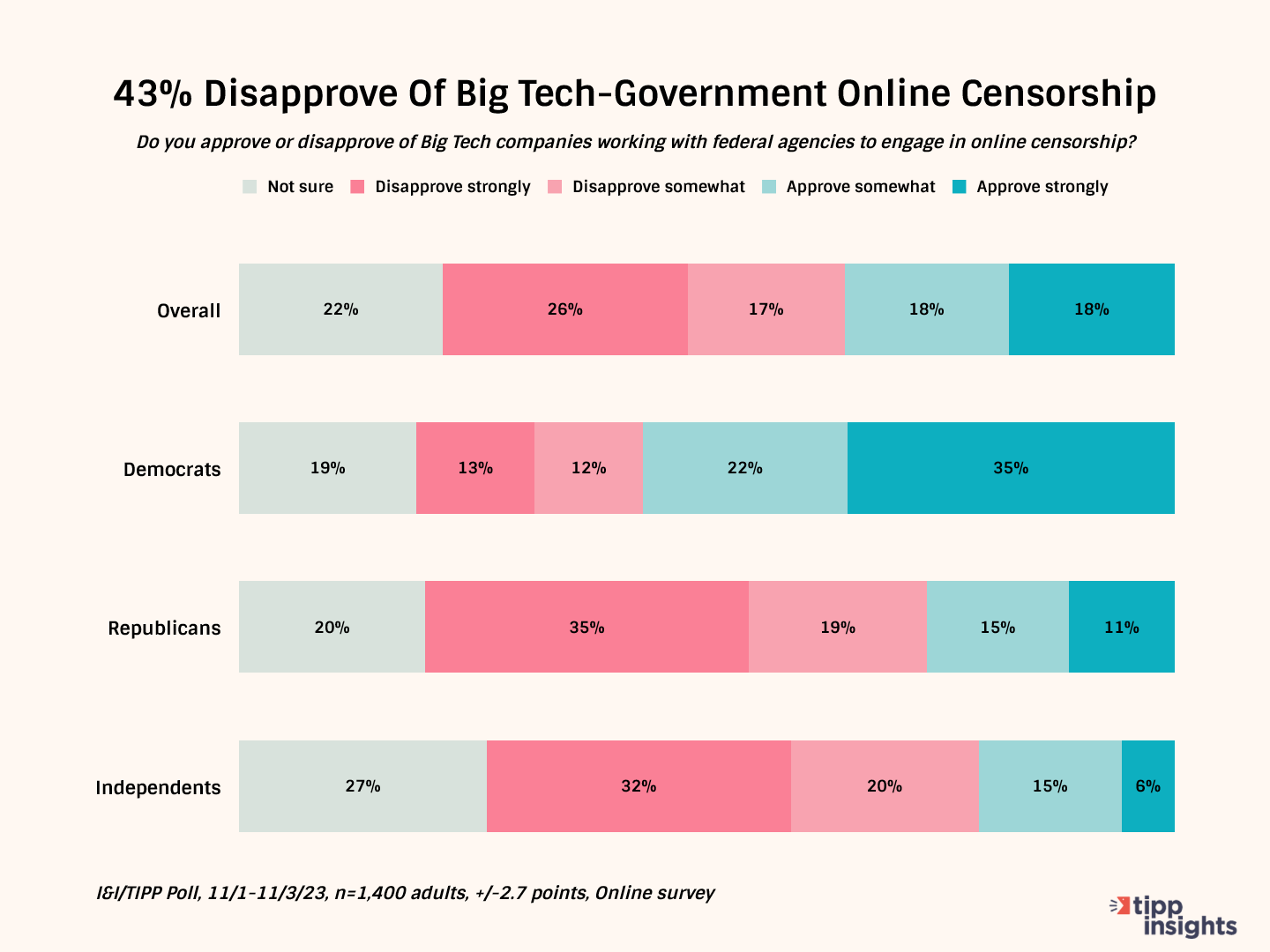 With growing complaints over online censorship, the online national I&I/TIPP Poll, taken from Nov. 1-3, asked 1,400 respondents the following question: "Do you approve or disapprove of Big Tech companies working with federal agencies to engage in online censorship?"