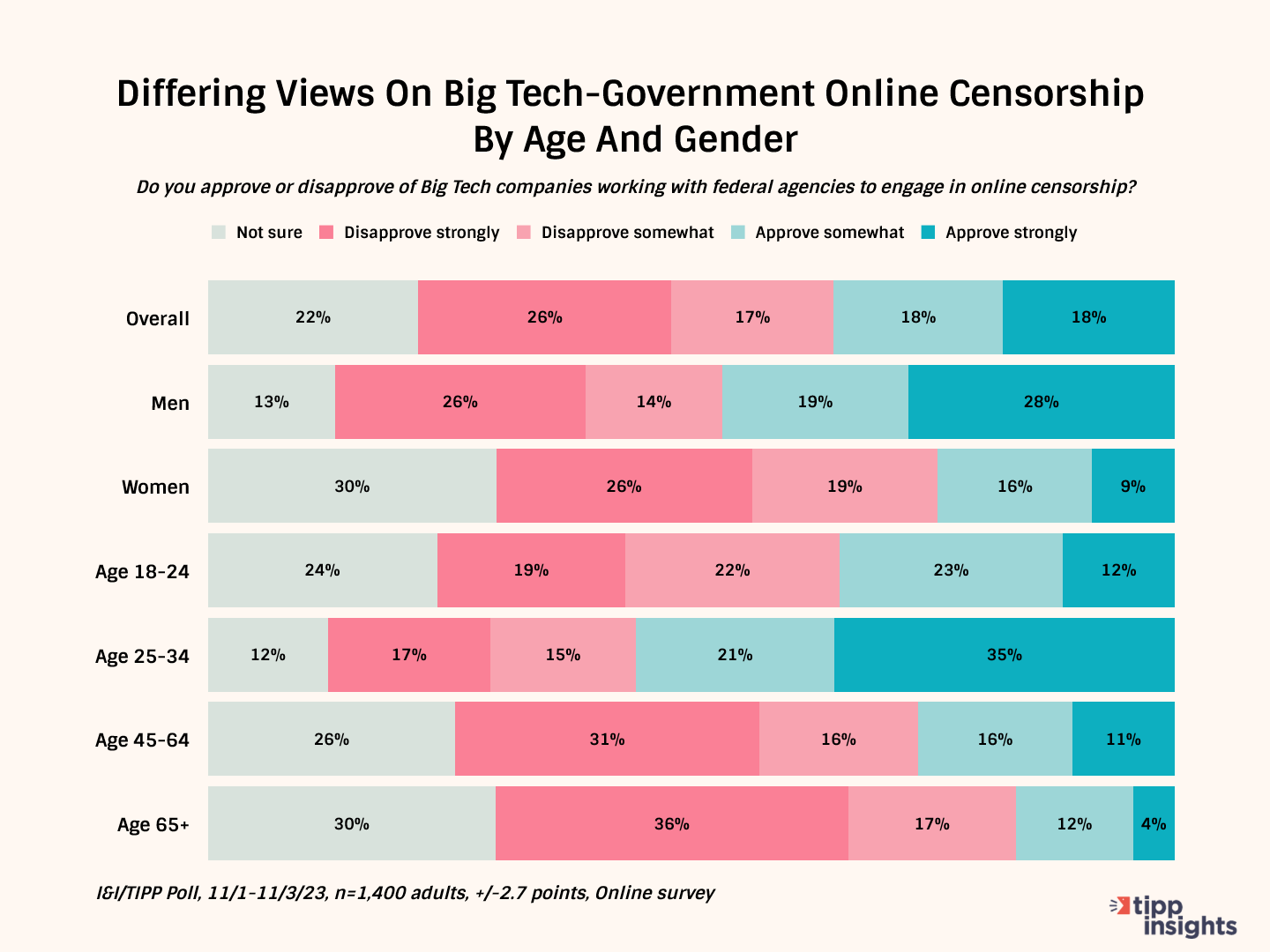 Men and women see the issue quite differently, it seems. Men favor the government-Big Tech censorship alliance, with 47% approving, 40% disapproving. Women, not so much, with just 25% approving, with 46% disapproving.