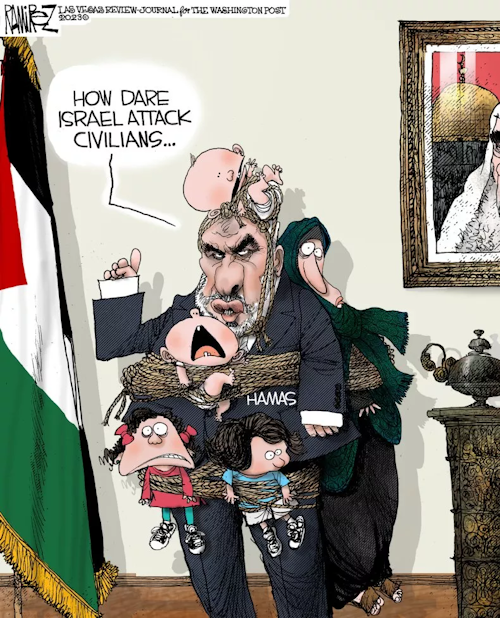 The urge to censor isn't limited to the online world. It's also part of what the City Journal recently called "The Tribal War Over Israel" now being waged in the media and on the streets. When two-time Pulitzer Prize-winning cartoonist Michael Ramirez of the Las Vegas Review-Journal drew a 'toon depicting senior Hamas official Ghazi Hamad and his human shields, his effort was absurdly canceled by the Washington Post for being "racist."