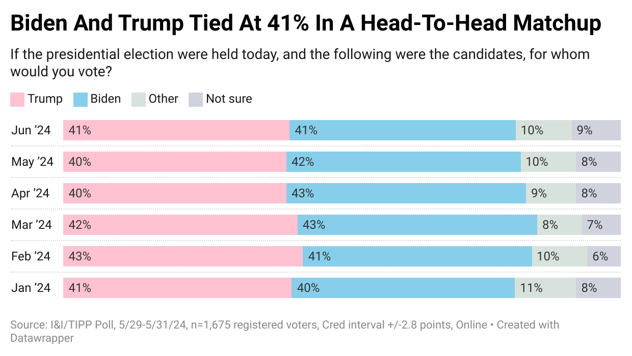 In the head-to-head poll between President Joe Biden and Trump, it’s now a statistical toss-up, 41% to 41%. But that’s an improvement for Trump from May, when he trailed Biden by 2 percentage points in that month’s I&I/TIPP poll (42% Biden to 40% Trump). The June poll has a margin of error of +/- 2.5 percentage points.