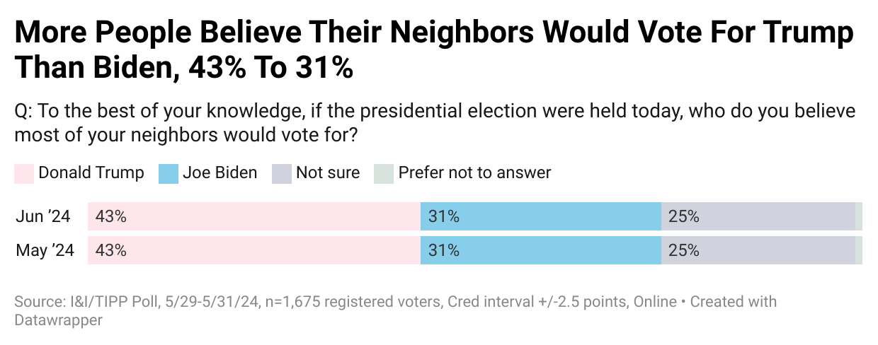 The poll was taken from Wednesday, May 29, through Friday, May 31. The verdict against Trump in New York state court was rendered on Thursday, May 30. So a significant share of the 1,675 registered voters who took the national online I&I/TIPP Poll actually knew that Trump had been found guilty of 34 felony counts.