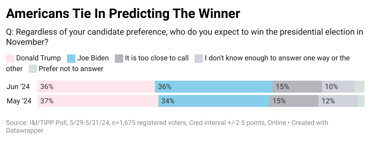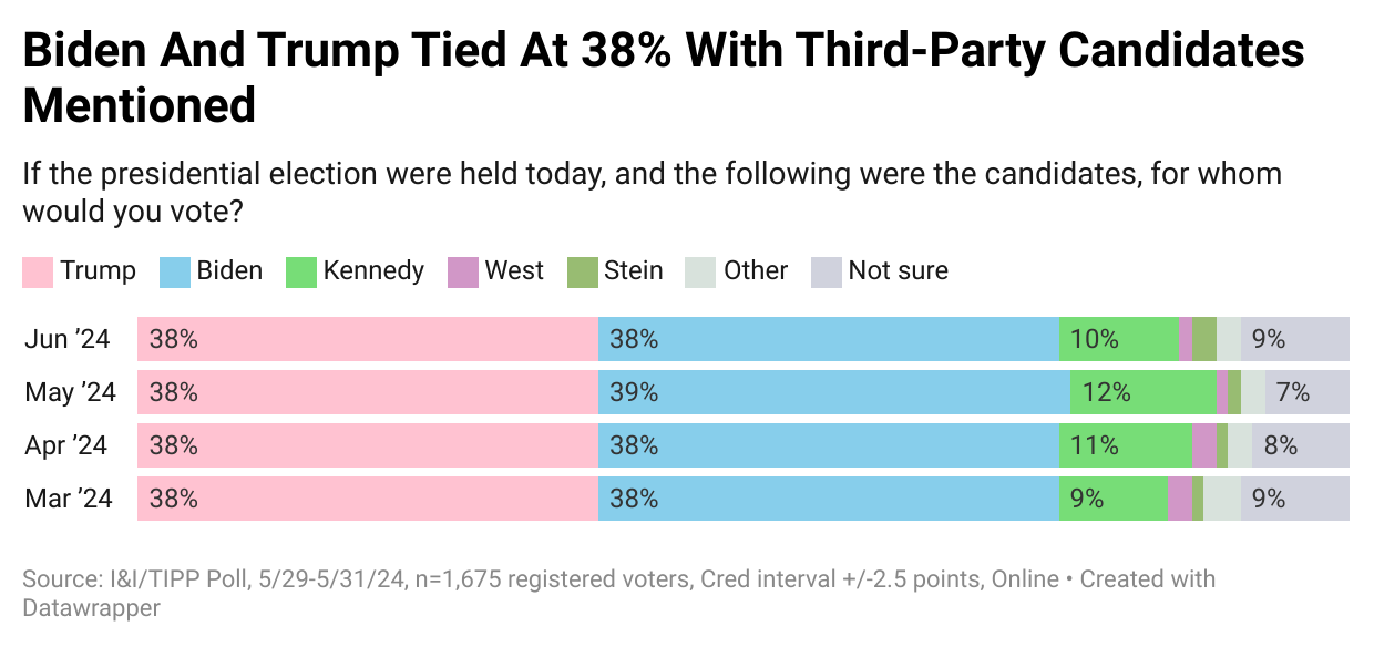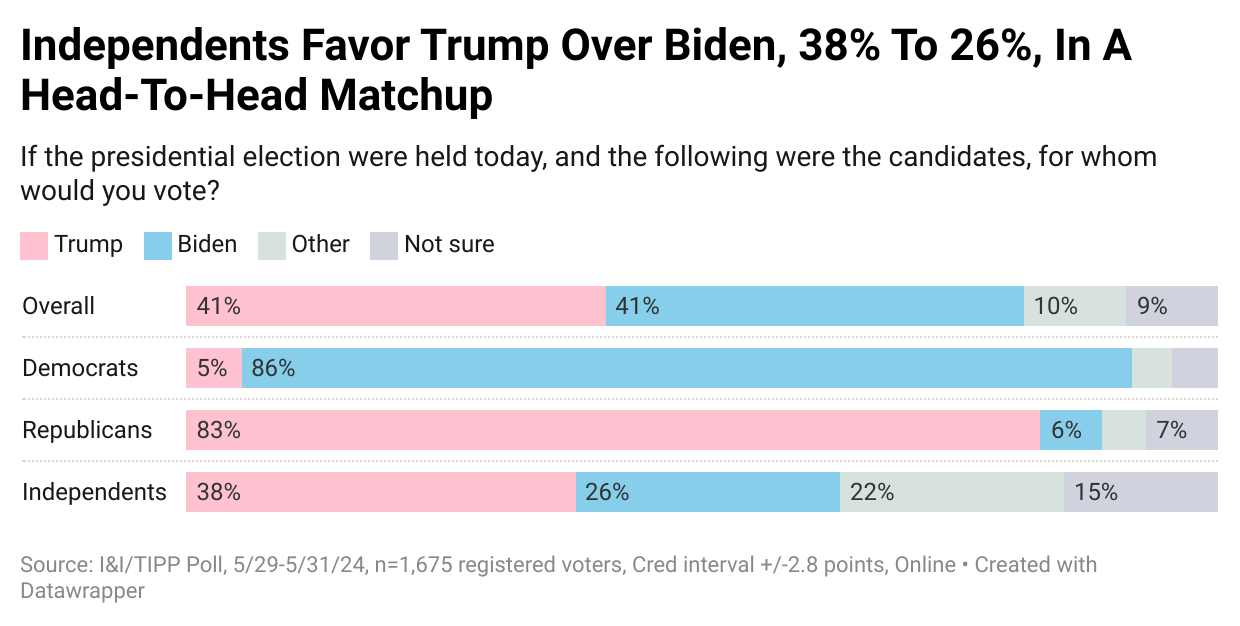 In May, 33% of independents supported Trump, 25% Biden, 18% RFK Jr. and 6% “other.” In June, that had become 31% Trump, 22% Biden, 18% RFK Jr., and 5% “other.” That shift among independents, who make up about 28% of the I&I/TIPP responses, seems to favor Trump.