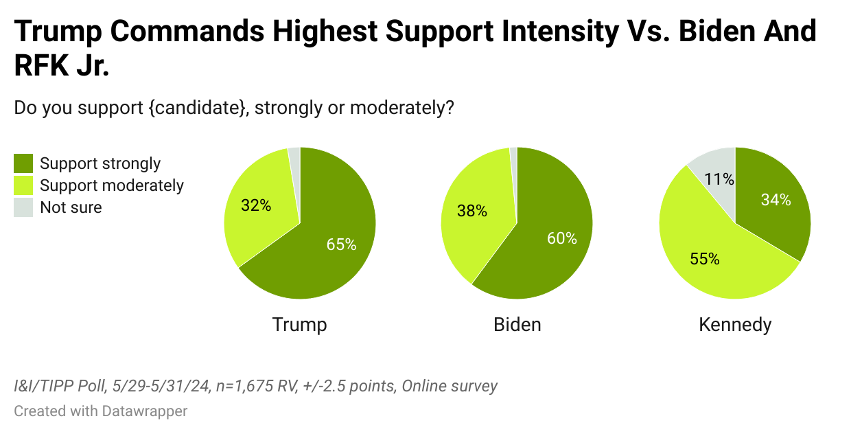 When the supporters of potential spoiler RFK Jr. are thrown into the mix, it becomes apparent that his support isn’t as strong as that of the two main candidates. Of his backers, only 34% support him “strongly,” 55% “moderately”, and 10% “not sure.”