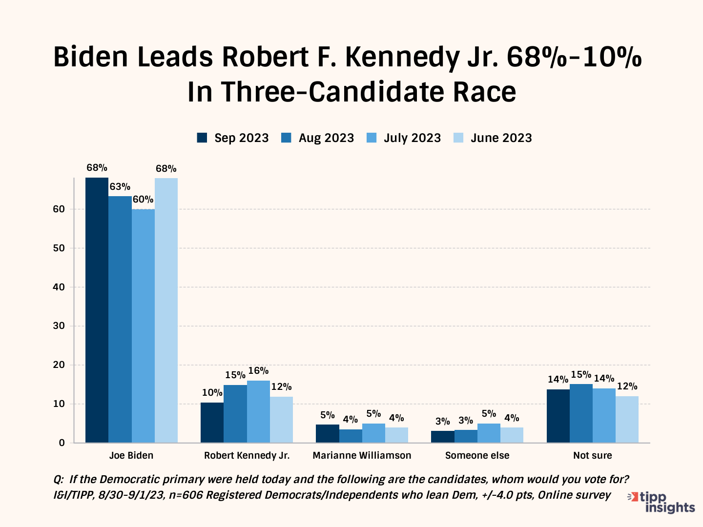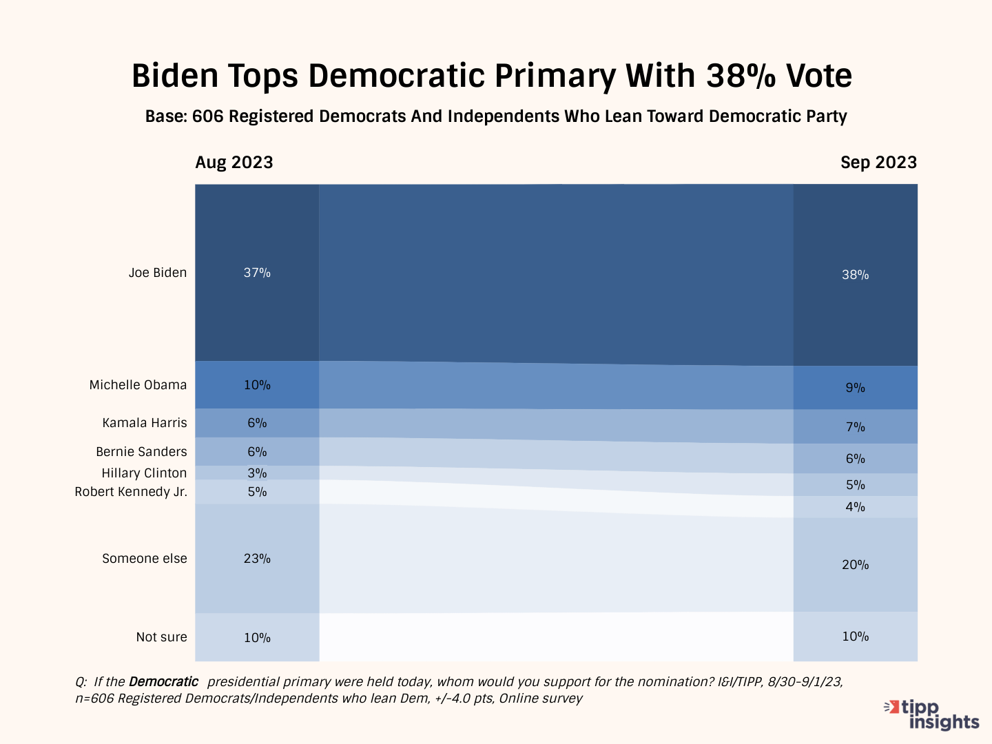 President Biden, though he remains solidly in front of potential challengers with 38% support from the 606 Democrats that answered the I&I/TIPP Poll.