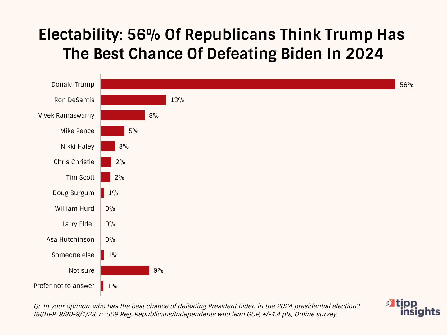 The poll also tested the electability of Republican contenders to determine who had the best chance of defeating President Biden in the 2024 presidential election. Trump led in "electability" with 56% of Republicans, followed by DeSantis (13%) and Ramaswamy (8%).