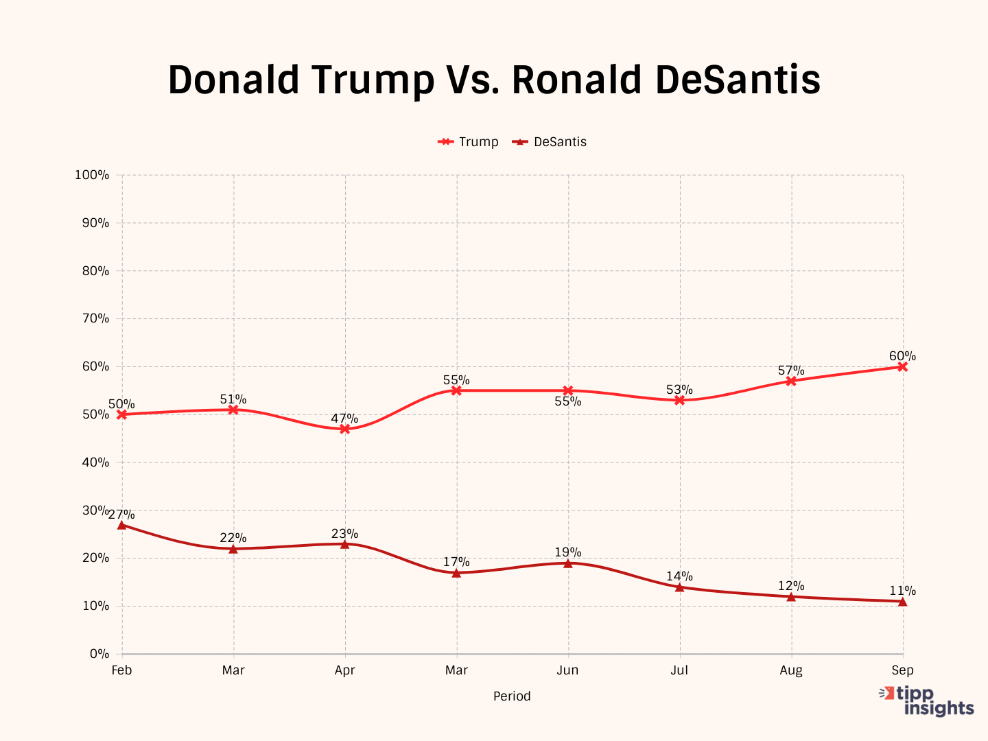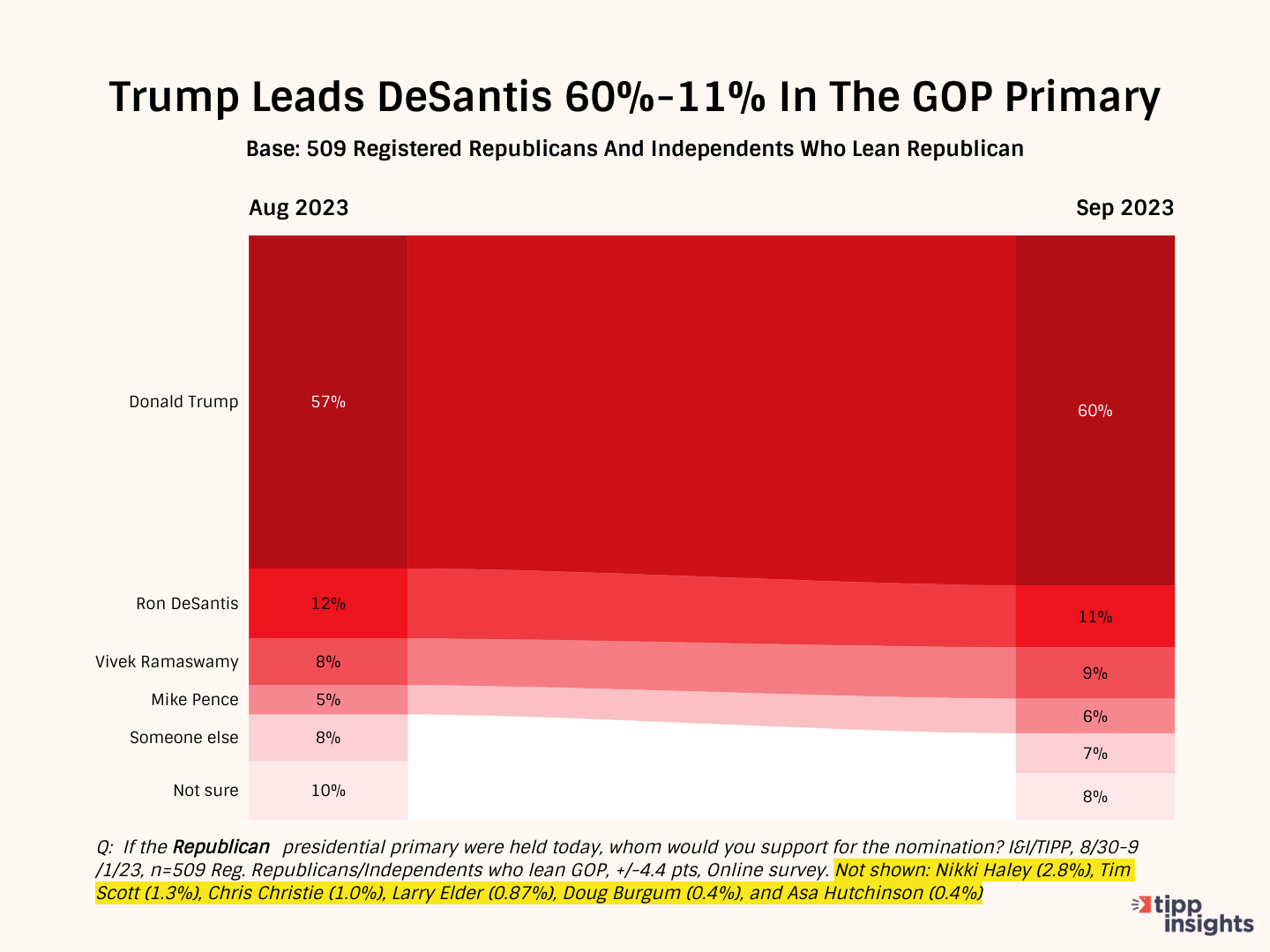 Even so, Trump's 49-point lead on DeSantis is the highest yet. There is little doubt that if the primaries were held in the coming weeks, Trump would win in a landslide. As recently as March of this year, Trump led his main challenger DeSantis by 51% to 22%, a 29-point gap.