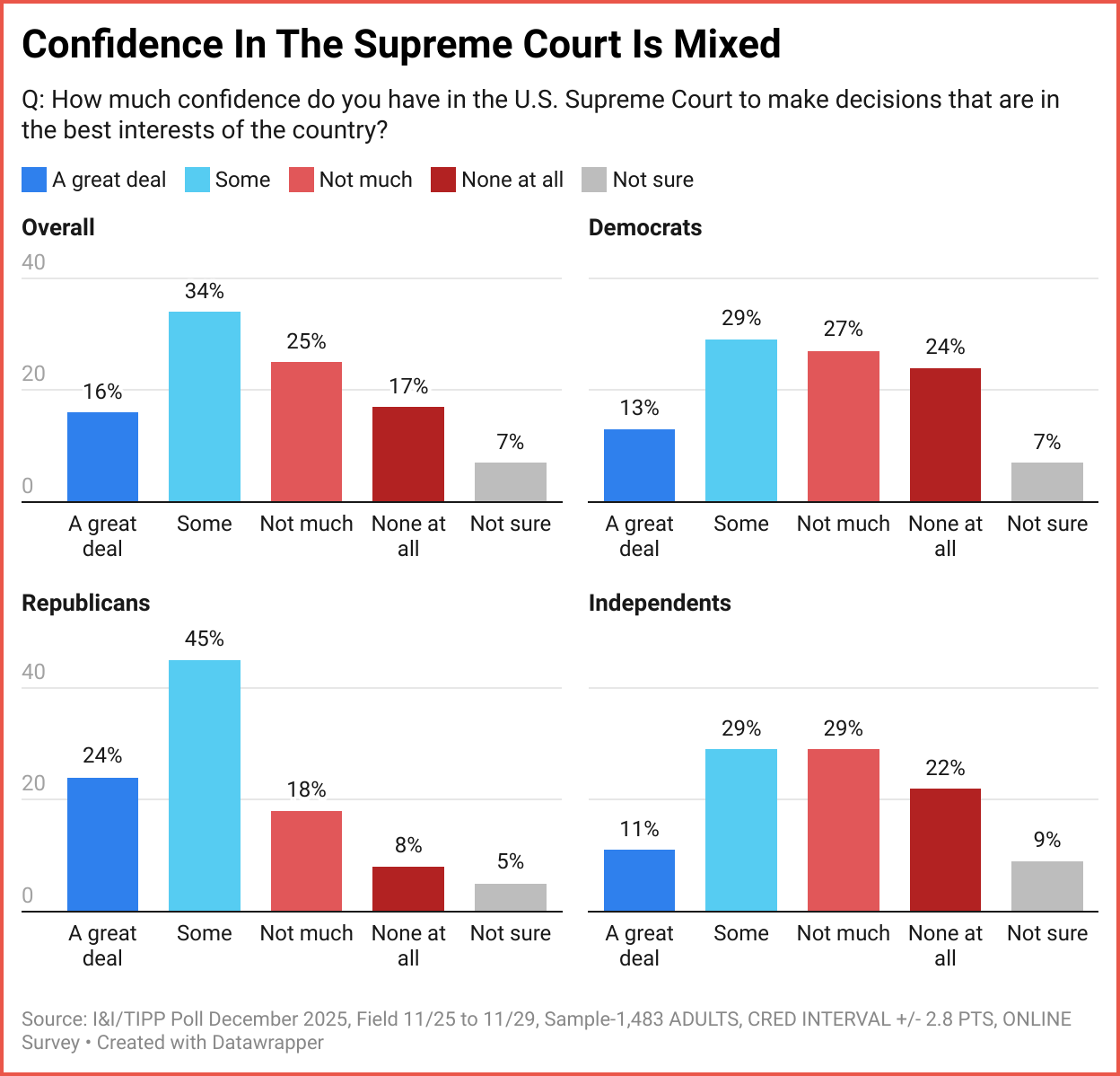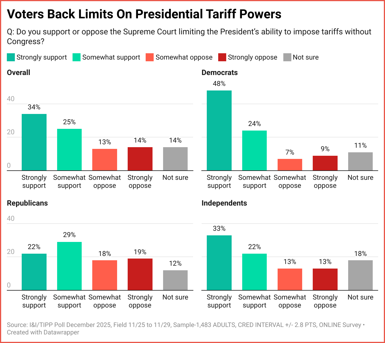 That wasn’t the only question. I&I/TIPP also asked about the hot-button topic of Trump’s tariffs, namely: “Do you support or oppose the Supreme Court limiting the President’s ability to impose tariffs without Congress?”