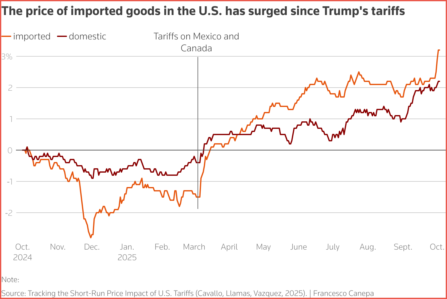 Import prices climbed more sharply than domestic prices after new tariffs took effect, suggesting some cost absorption and supply-chain adjustment.