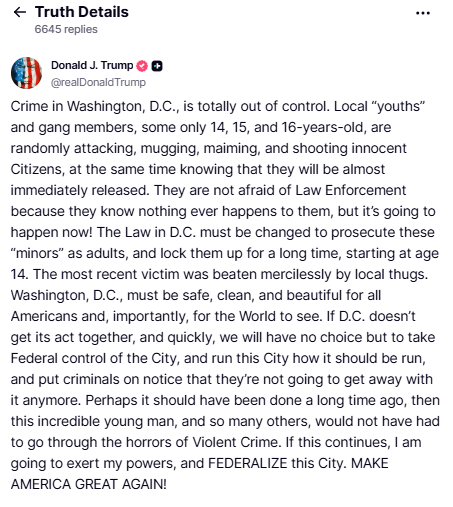 “The most recent victim was beaten mercilessly by local thugs,” Trump added. “Washington D.C., must be safe, clean, and beautiful for all Americans and, importantly, for the World to see. If D.C. doesn’t get its act together, and quickly, we will have no choice but to take Federal control of the City, and run this City how it should be run, and put criminals on notice that they’re not going to get away with it anymore.”