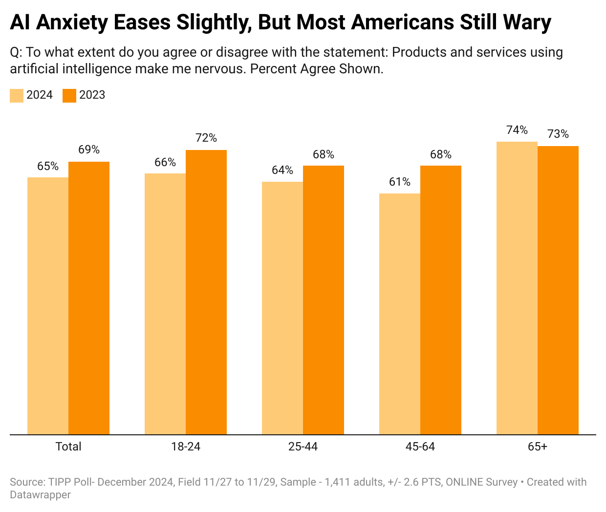 Our data from last year suggests that a few more people have gotten used to AI, though the difference is not substantial. A year ago, 69% were nervous about using AI products and services, and 23% were comfortable doing so.
