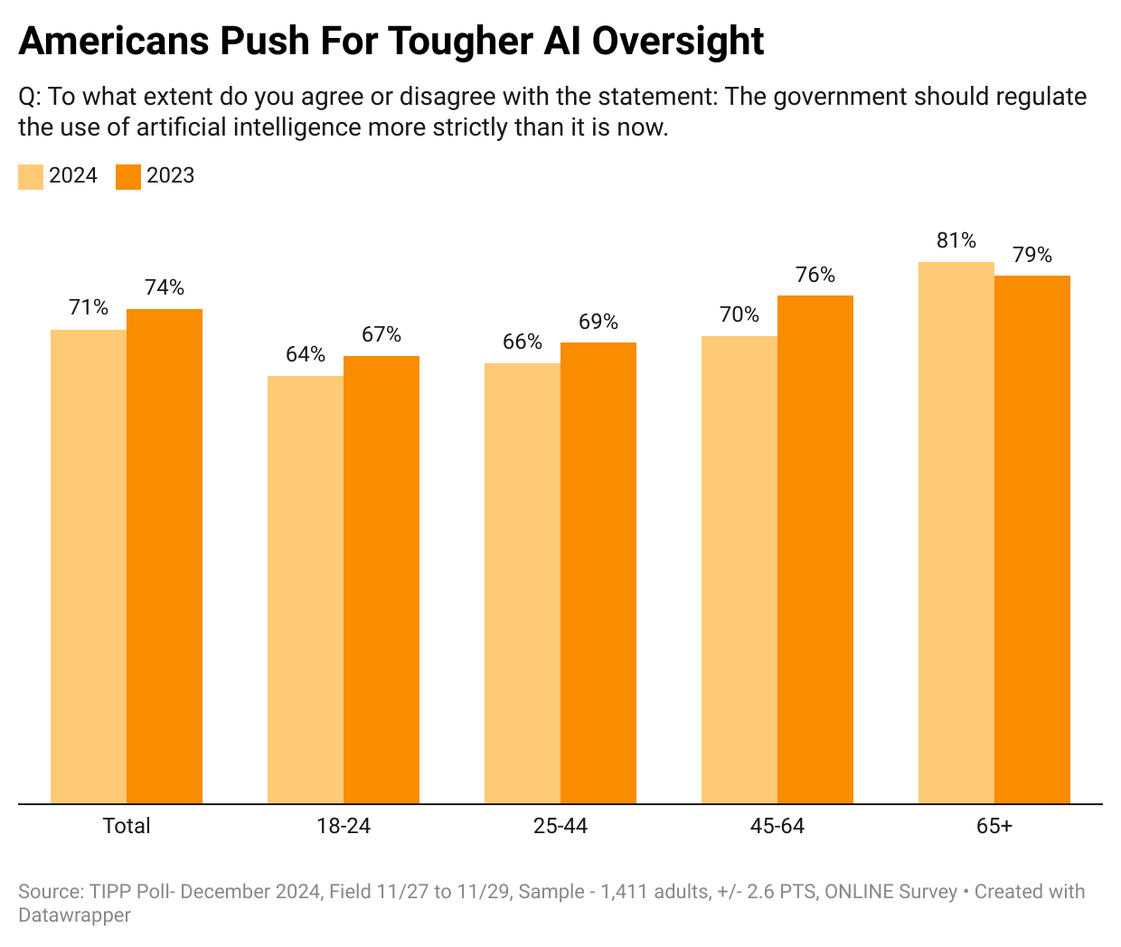 The need to control AI has turned out to be a unifying issue—72% of Democrats and 73% of Republicans want the administration to do more. The number of people wanting the government to play a bigger role in controlling AI has increased marginally, about 2%, from a year ago.