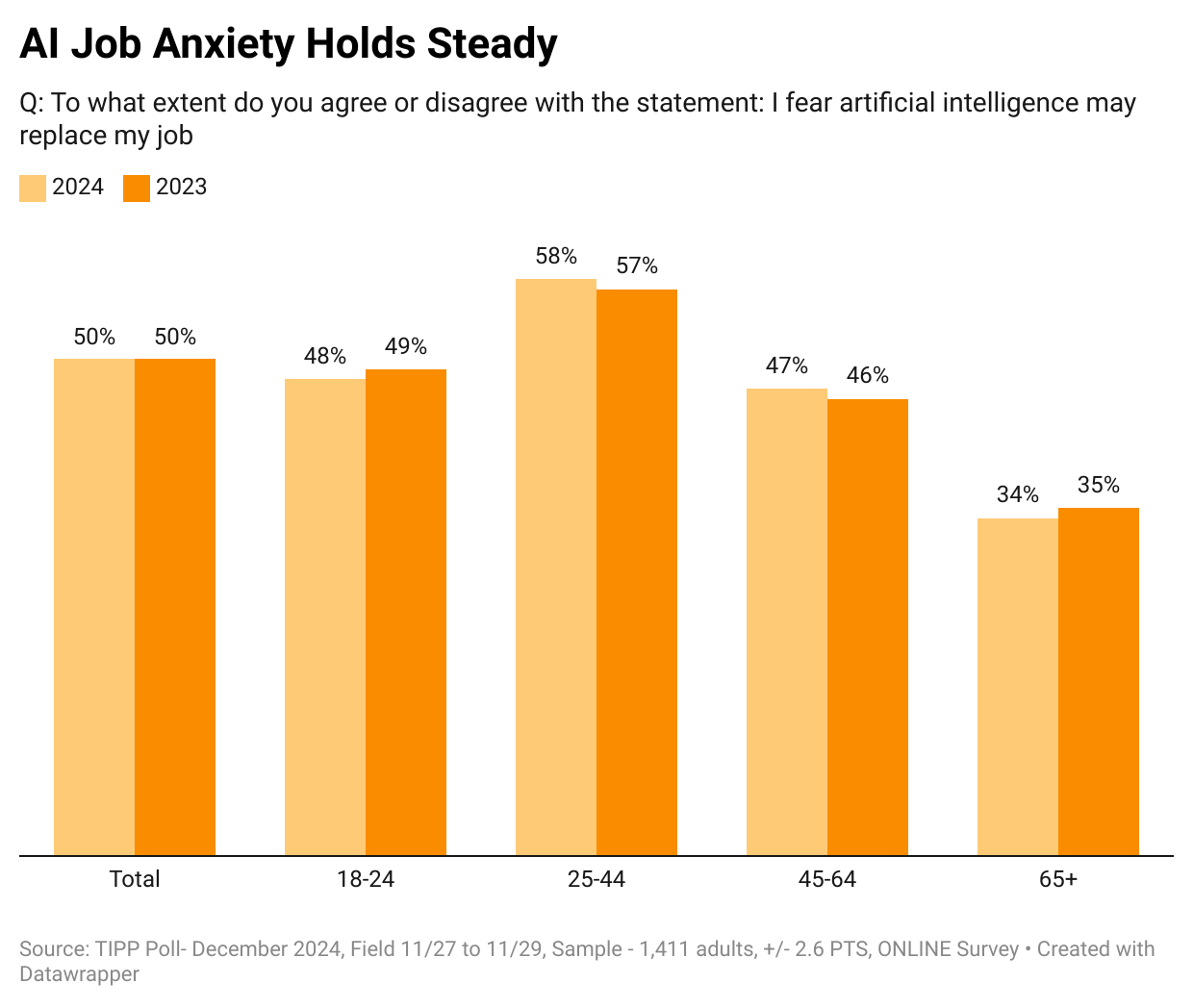Much of the unease and trepidation stems from the fear that automation and AI-powered systems will eliminate jobs, especially those at the entry-level. Trump touted the initiative as a major job creator, promising over 100,000 new positions almost immediately. Yet, TIPP Poll data shows that 50% of Americans still fear AI will cost them their livelihoods.