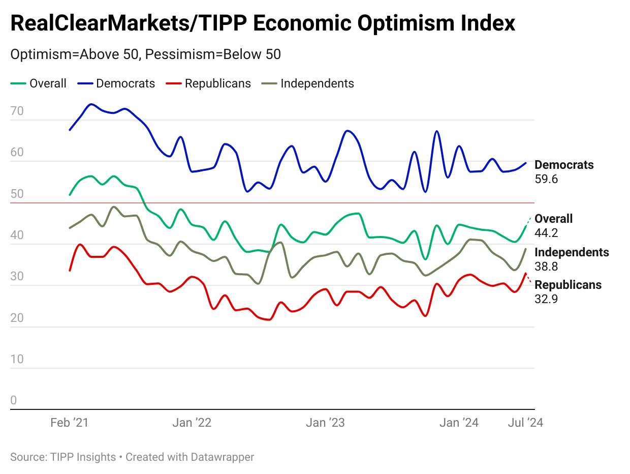 The RealClearMarkets/TIPP Economic Optimism Index, a leading gauge of consumer sentiment, rebounded sharply by 9.1% in July to 44.2. Since September 2021, the Index has remained in negative territory (35 consecutive months). Still, July’s reading of 44.2 is 10.2% lower than the historical average of 49.2.