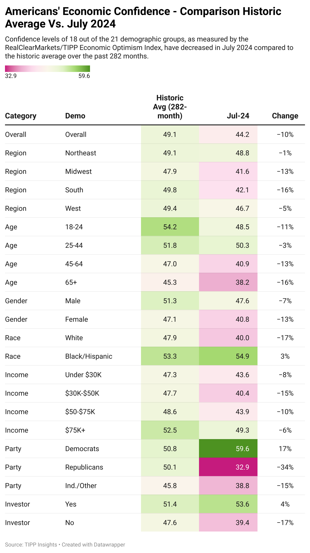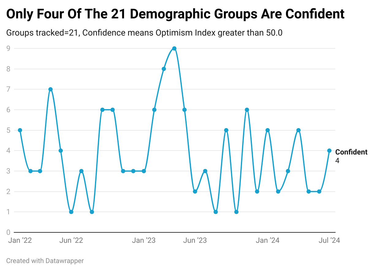 Economic optimism levels for 18 out of 21 demographic groups were lower in June 2024 than the historical average of the past 282 months.