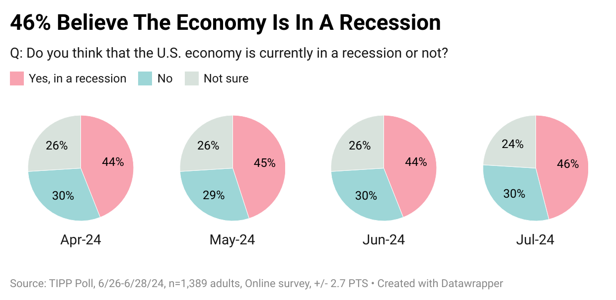 Four in ten (46%) believe we are in a recession, while 30% think we are not. Another 24% are not sure.