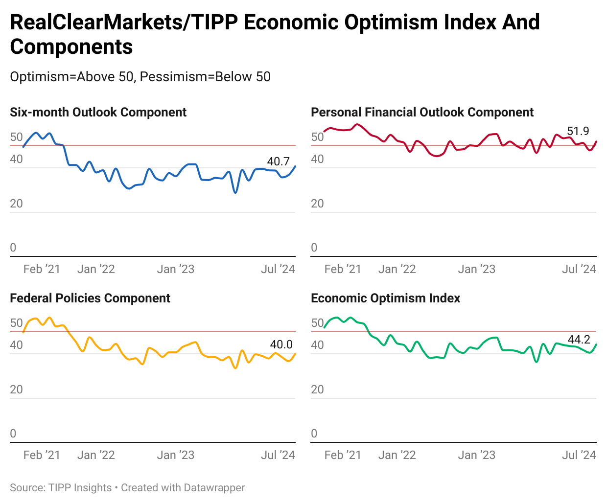 The RCM/TIPP Economic Optimism Index has three key components. In July, all three components showed improvement. The Index and its components range from 0 to 100. A reading above 50.0 signals optimism and a reading below 50.0 indicates pessimism. 50 is neutral.