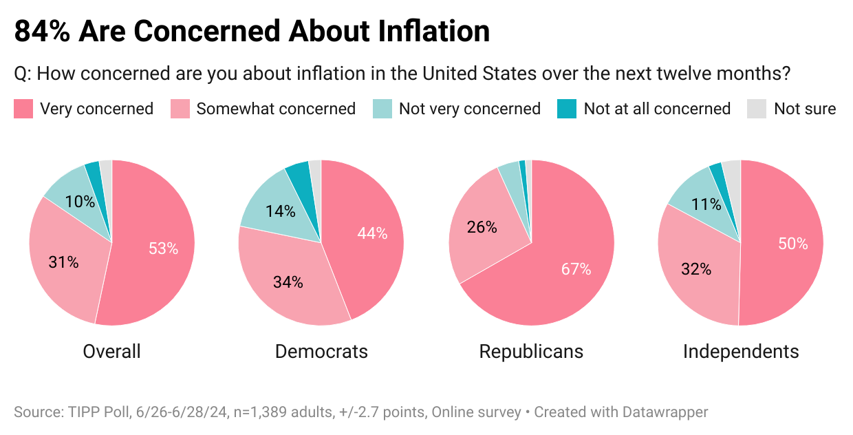 The survey showed that 84% are worried about inflation. One-half (53%) are very concerned, and another 31% are somewhat concerned.
