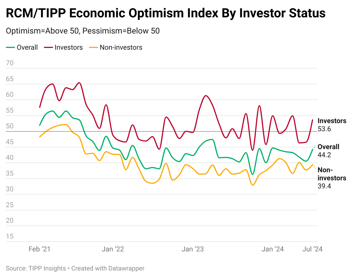 The economic optimism gap between investors and non-investors widened to 14.2 in July from 8.8 in June and 6.2 in May.
