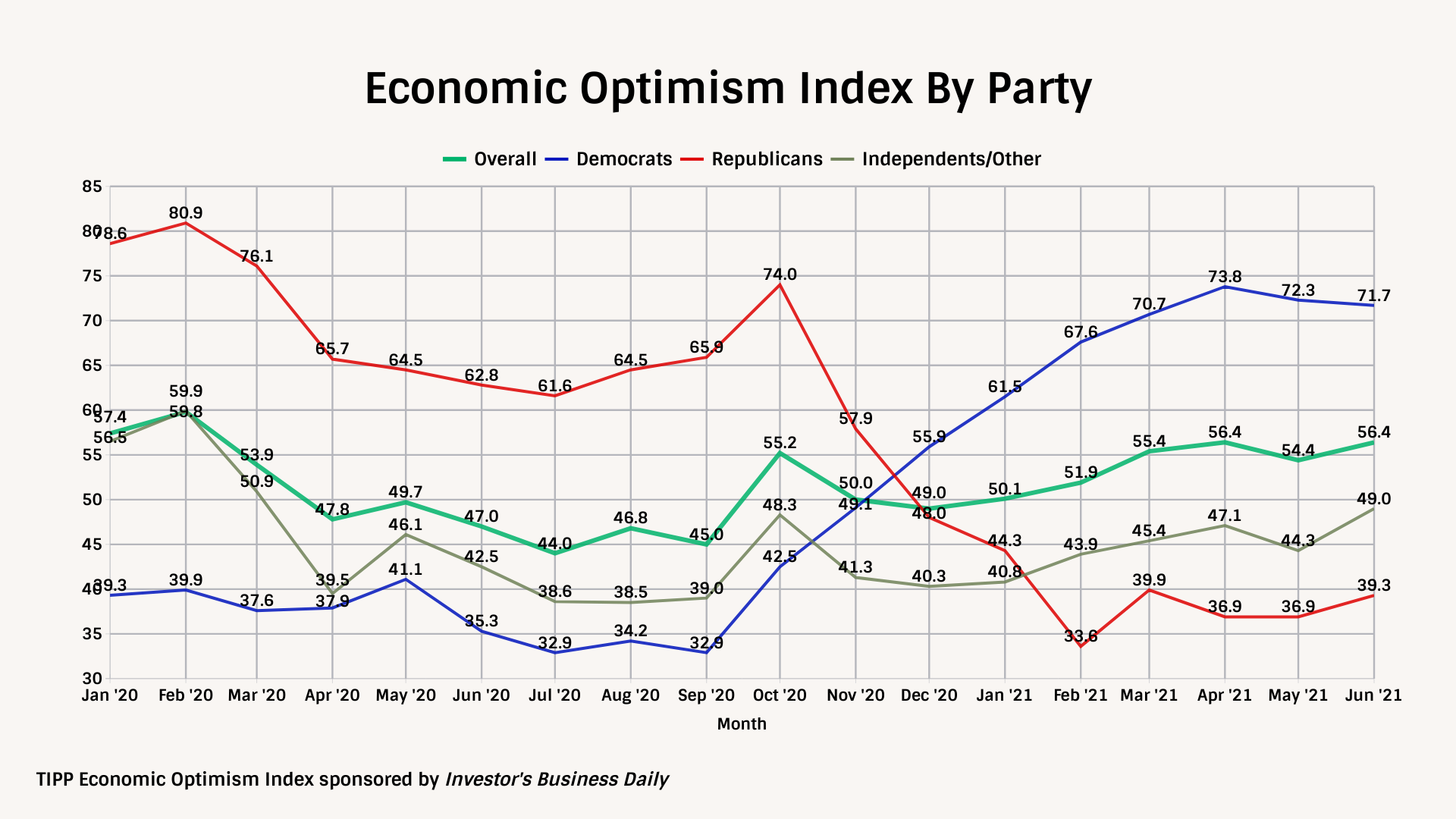 The IBD/TIPP Economic Optimism Index is the first monthly measure of consumer confidence. It accurately predicts monthly changes in sentiment in other well-known surveys conducted by The Conference Board and the University of Michigan.