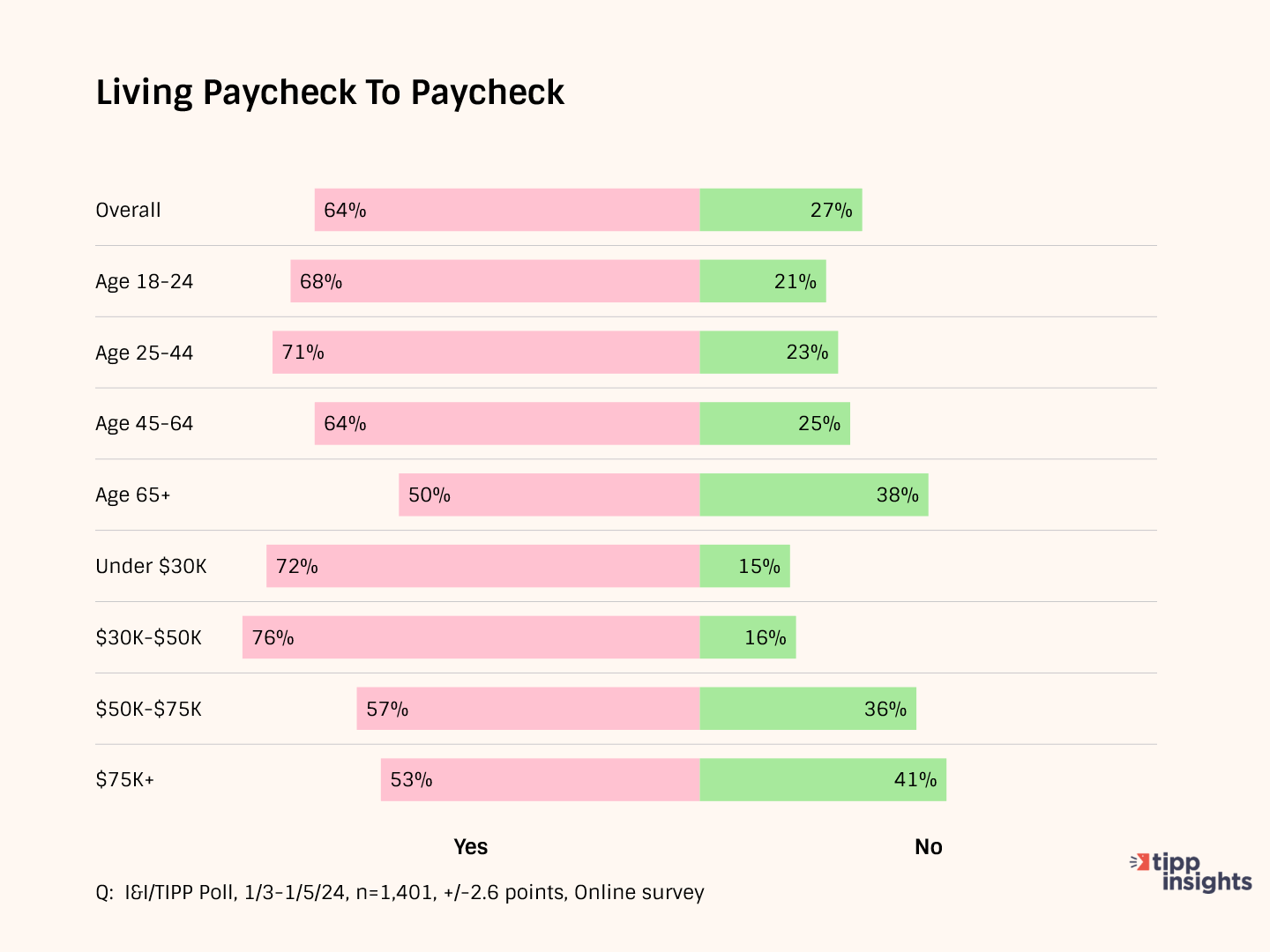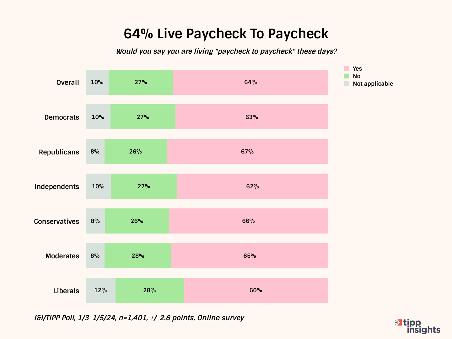 While the U.S. remains a wealthy country compared to others, nearly two-thirds of Americans say they are "living 'paycheck to paycheck' these days" in the latest I&I/TIPP Poll, conducted from Jan. 3-5 from among 1,401 registered voters. The poll has a +/-2.6 percentage point margin of error.