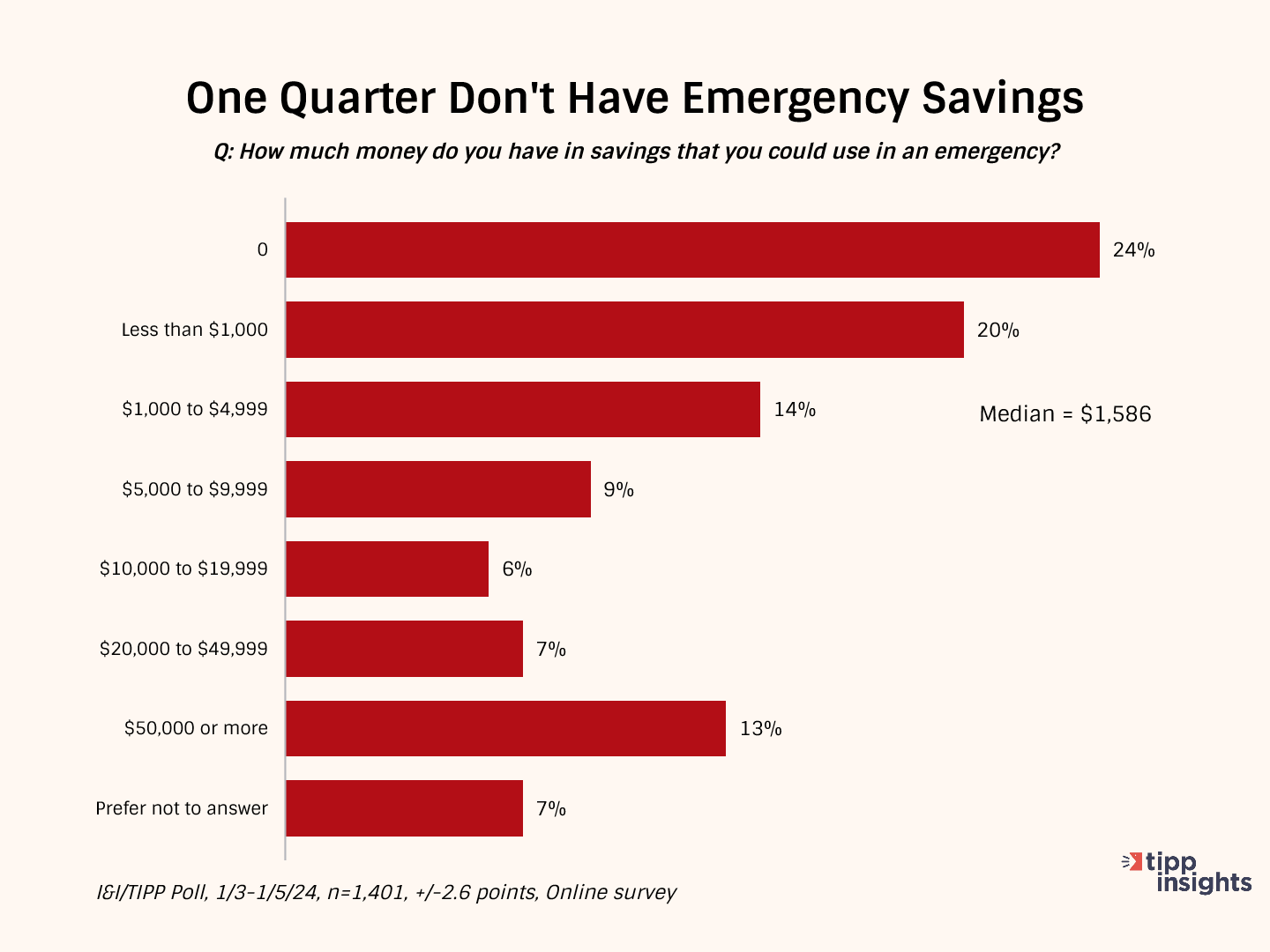 To shed further light on this little-discussed problem, the I&I/TIPP Poll asked a more specific question: "How much money do you have in savings that you could use in an emergency?"