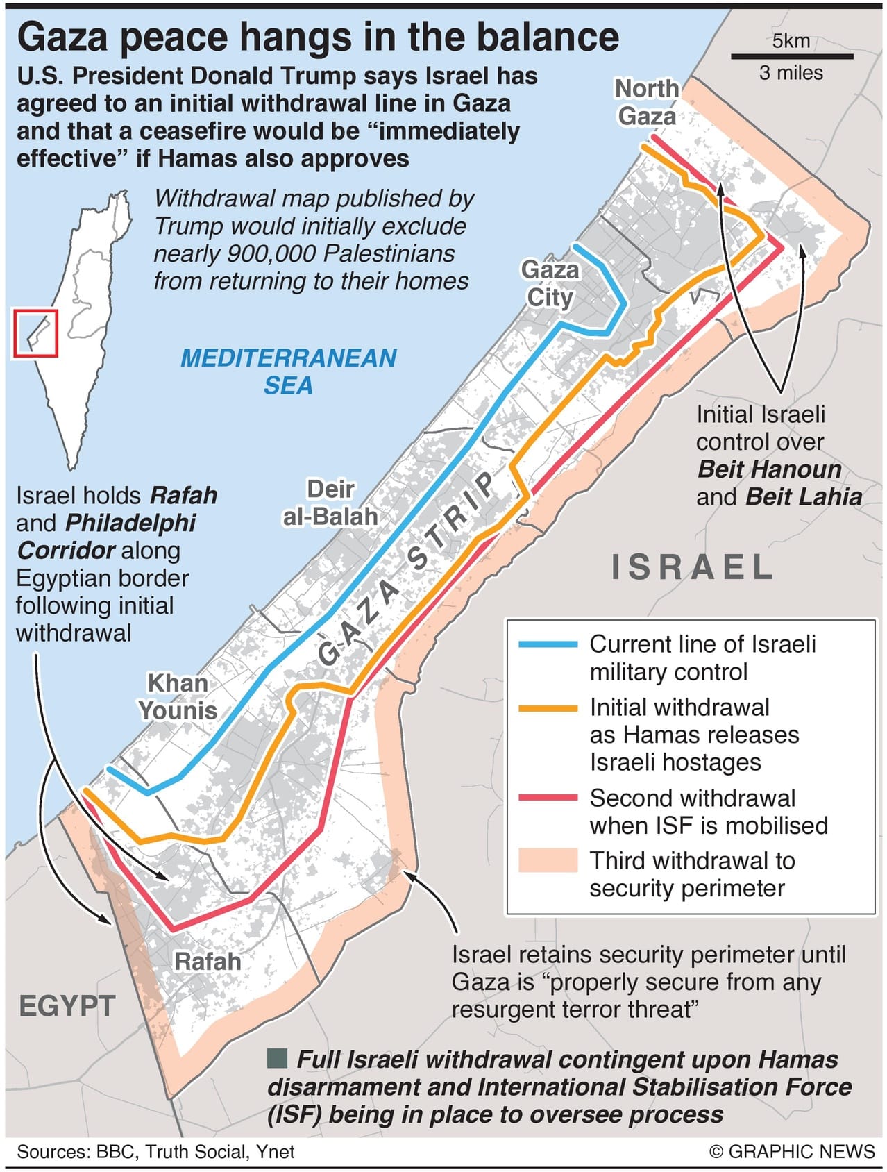 The withdrawal map published by Trump would initially exclude nearly 900,000 Palestinians from returning to their homes, according to population distribution data on the Gaza Strip, the BBC said.