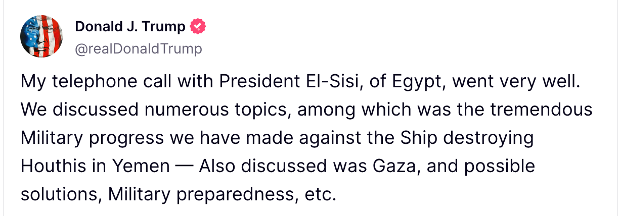 President Donald Trump posted on Truth Social that his recent telephone call with Egyptian President Abdel Fattah El-Sisi "went very well." Trump stated they discussed various topics, including military advancements against the Houthi rebels in Yemen, particularly their ship-destroying capabilities.
