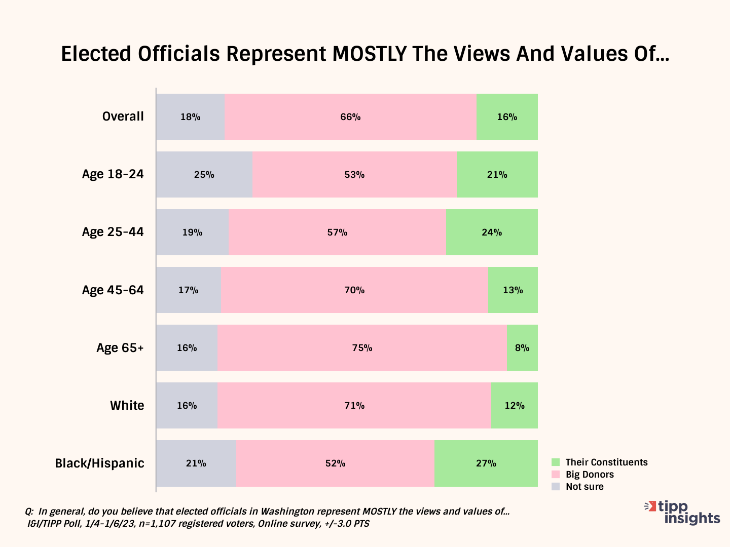Among voters from 18-24 years of age, just 53% responded "big donors," while 21% said "their constituents." That compares to the 25-44 age group (57% "big donors", 24% "their constituents"), the 45-64 age group (70% big donors, 13% constituents) and age 65+, the most negative group at 75% "big donors," compared to a mere 8% for "their constituents."