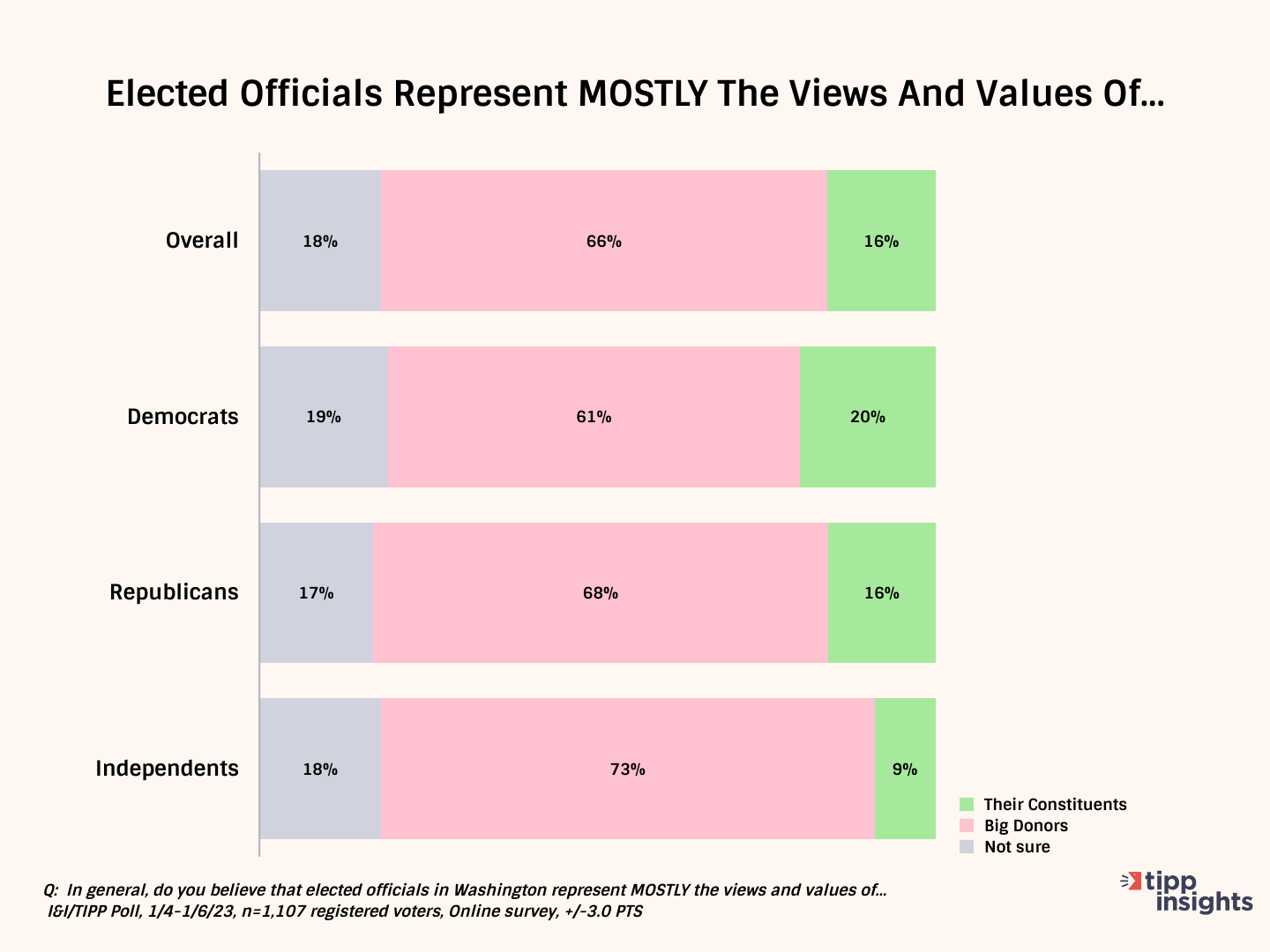 The answer was overwhelming and doesn't bode well for official Washington. Two-thirds (66%) said elected officials represent mostly the views and values of their big donors, not average Americans. Just 16% said they felt their elected officials represented their constituents. Another 18% said they weren't sure.