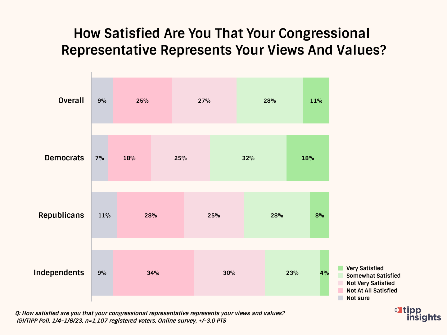 This time, the political differences showed. Overall, 50% of Democrats called themselves "satisfied," vs. 43% "dissatisfied," with their representative. Not so Republicans or independents. For GOP voters, just 36% said they were happy with their representative, 53% unhappy.