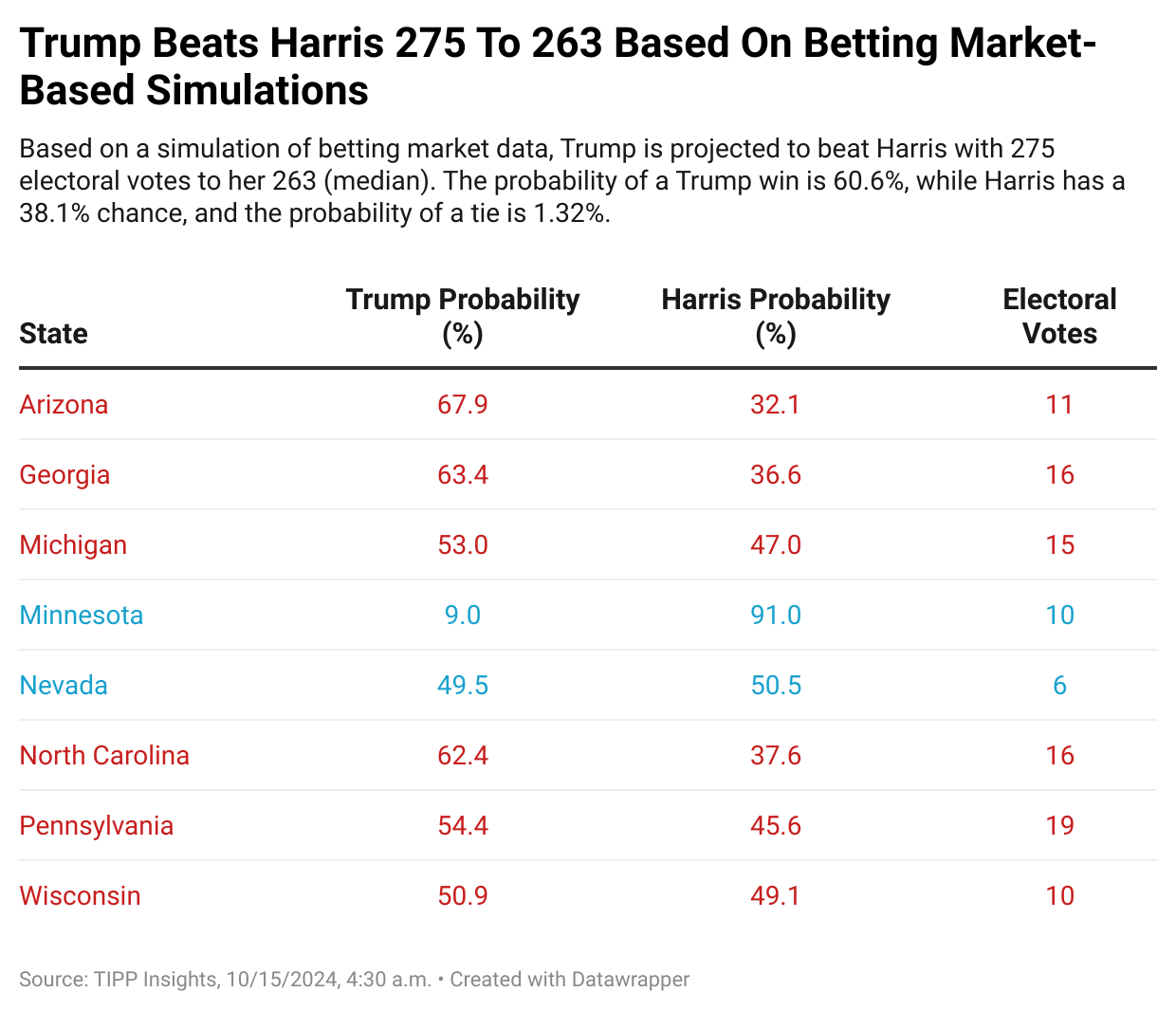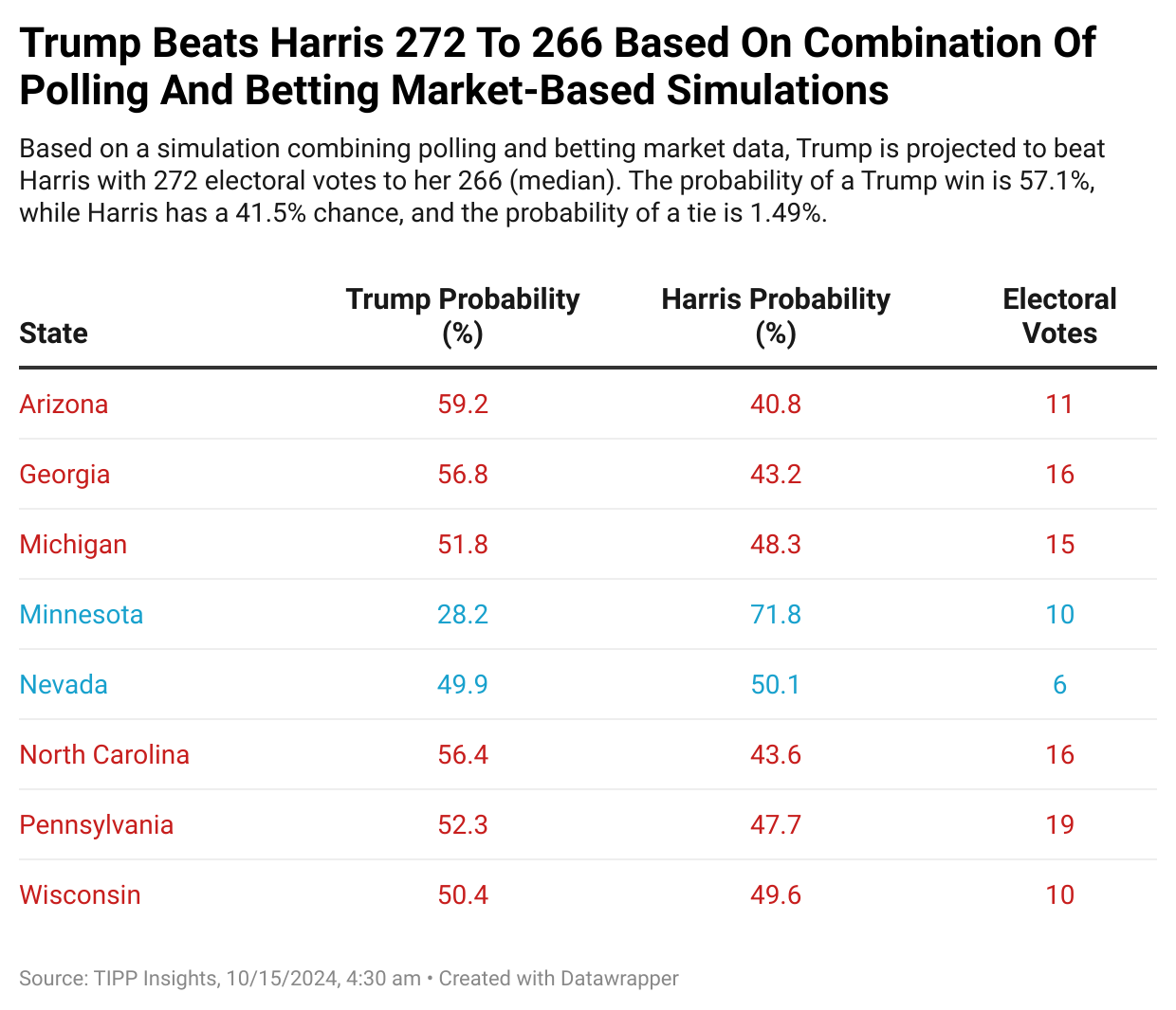 This section details Trump’s and Harris’s probabilities of victory based on polling data across battleground states. The simulation model ran 1,000,000 trials using polling averages for each state.