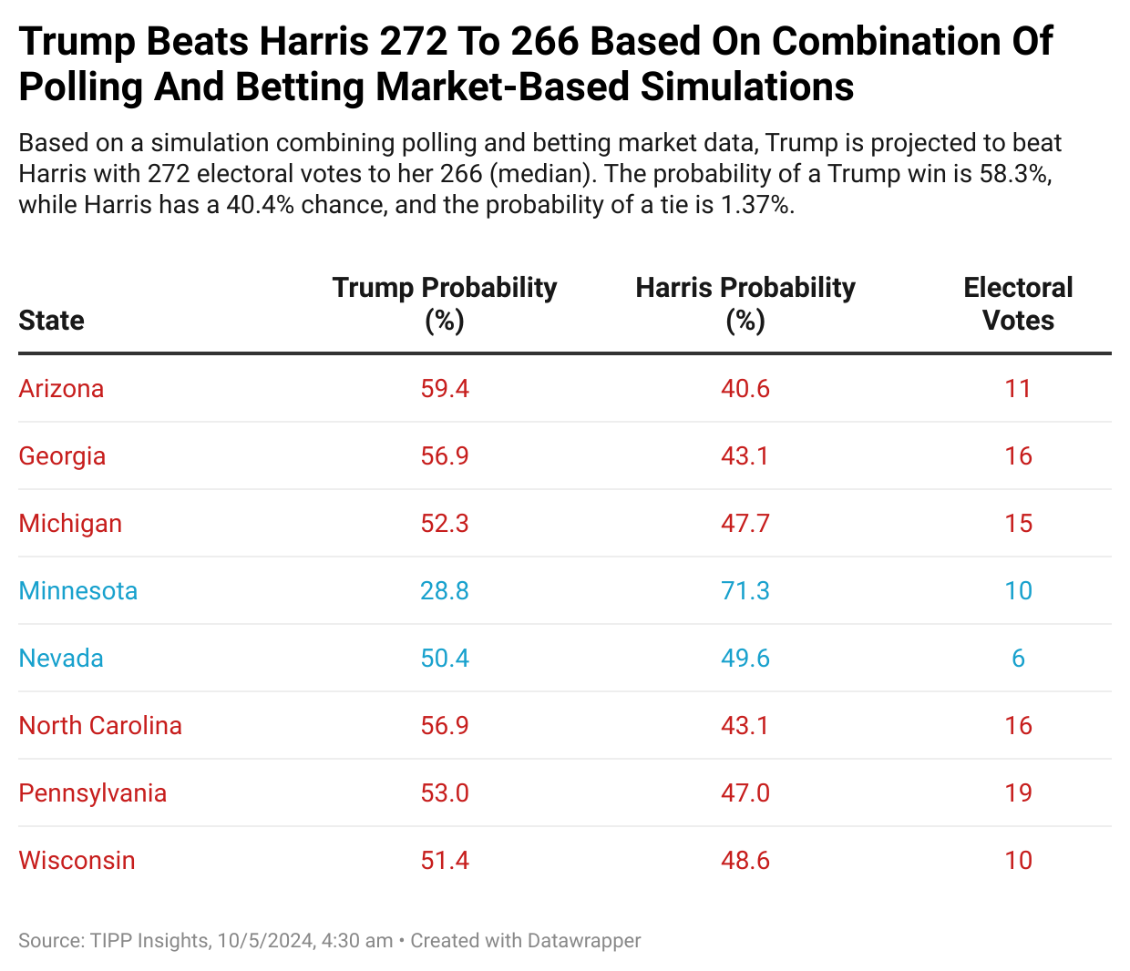 This section details Trump’s and Harris’s probabilities of victory based on polling data across battleground states. The simulation model ran 1,000,000 trials using polling averages for each state.