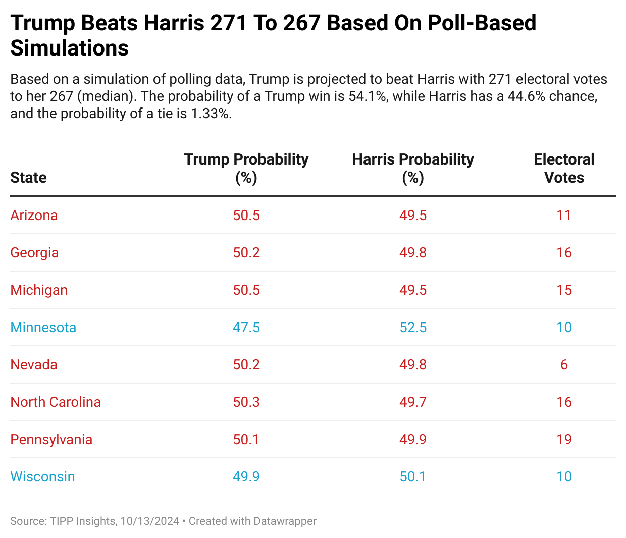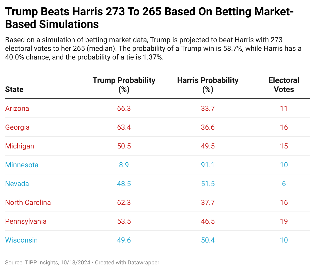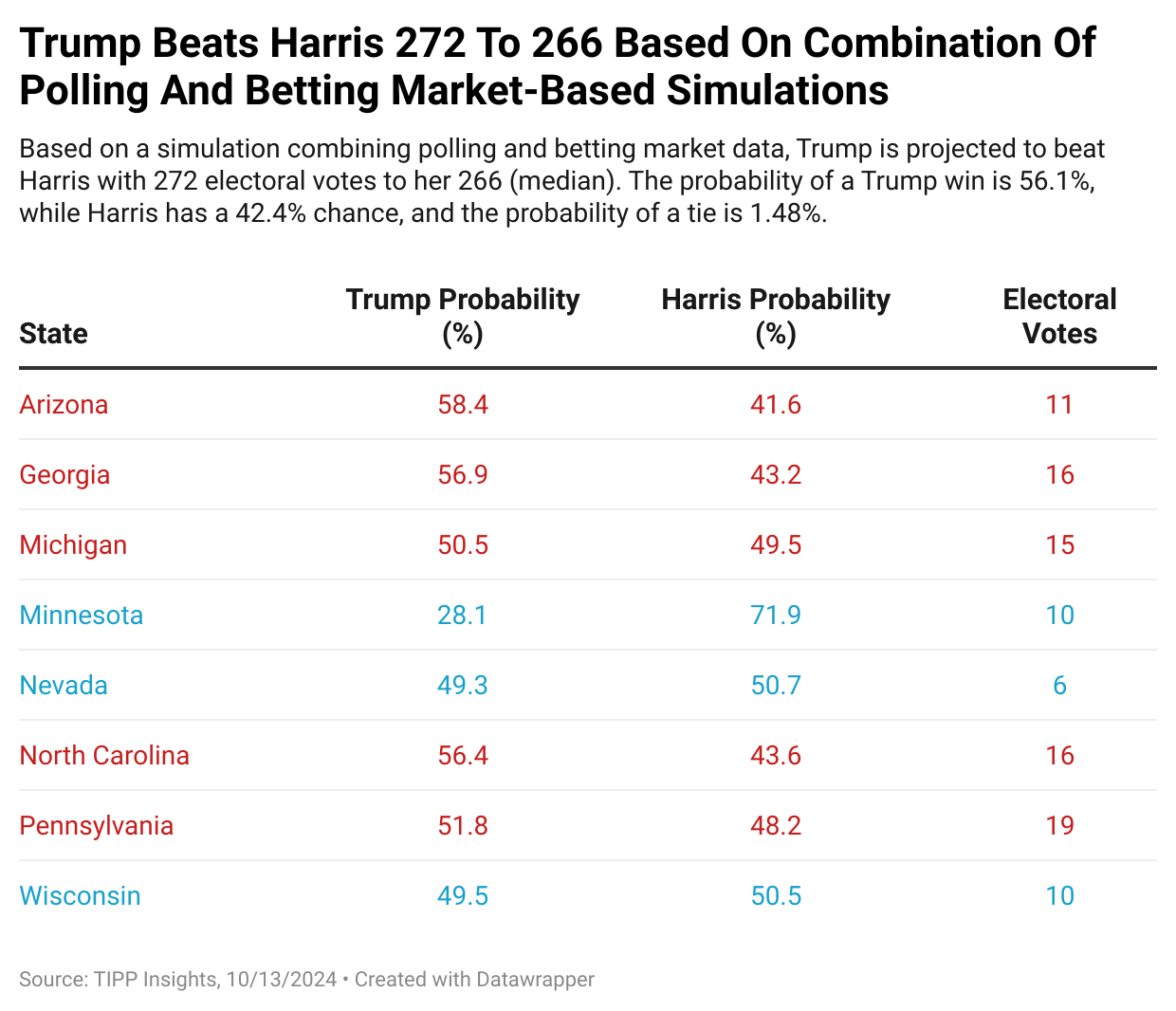 This section details Trump’s and Harris’s probabilities of victory based on polling data across battleground states. The simulation model ran 1,000,000 trials using polling averages for each state.