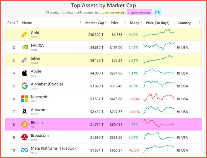 At roughly $1.8 trillion in market value, Bitcoin now ranks among the world’s ten most valuable assets, placing it alongside major corporations and commodities and underscoring how large the market has become even after a soft year.