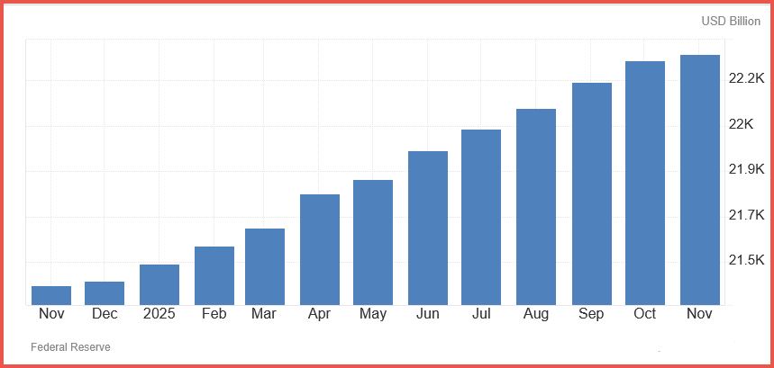 This chart shows U.S. M2, a broad measure of money in circulation that includes cash, checking accounts, savings, and other near-money assets. After a pullback in 2022 and 2023, M2 has climbed steadily to a new record of $22.32 trillion as of November 2025, pointing to looser financial conditions. Historically, rising M2 supports consumer spending, credit growth, and higher prices for assets such as stocks and housing.