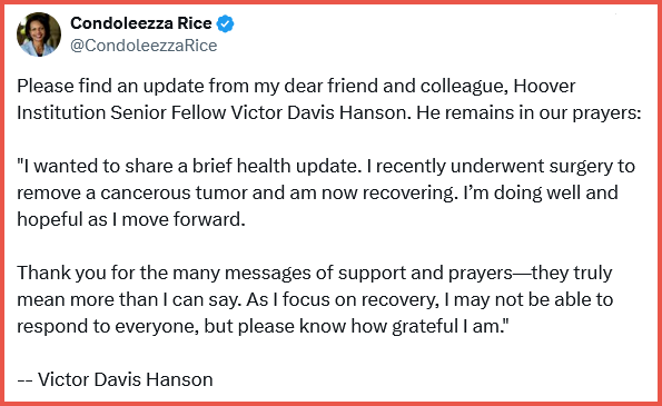 The prominent historian and Hoover fellow said he recently underwent surgery to remove a cancerous tumor and is now recovering, adding that he is doing well and remains hopeful. We pray for his speedy recovery.
