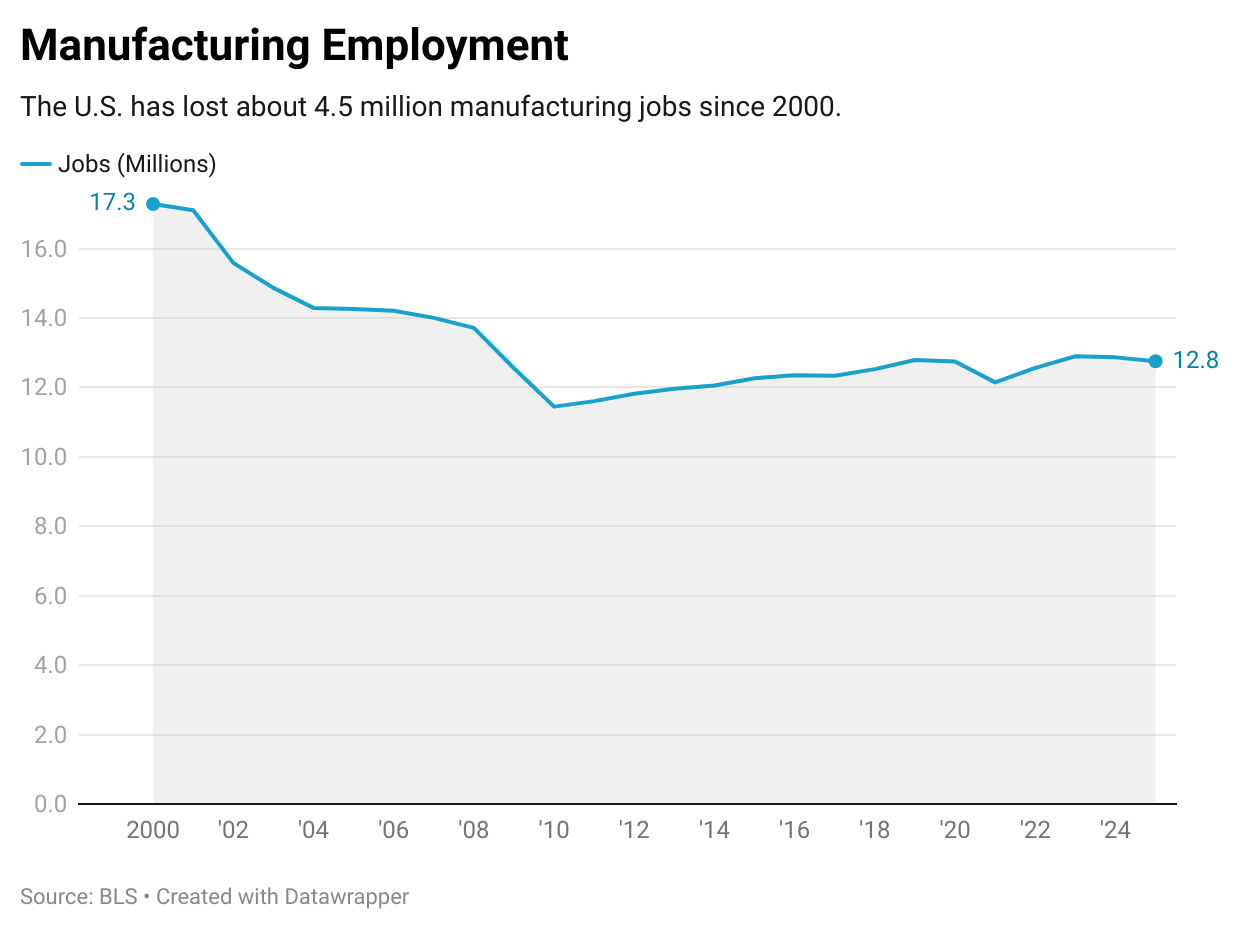 In 1992, there were approximately 17,618,000 American jobs in manufacturing. For March 2025, the preliminary estimate of American manufacturing jobs is approximately 12,950,000, based on the BLS Current Employment Statistics survey (seasonally adjusted)—meaning that there has been a drop of about 4.67 million jobs over the intervening 33 years. However, not all of the job losses are caused by outsourcing to countries with lower labor costs. Automation and technological advances have also contributed to the decline. Americans don't buy transistor radios, portable cassette players, camcorders, pagers, and beepers—so there's no need to make these products anymore.