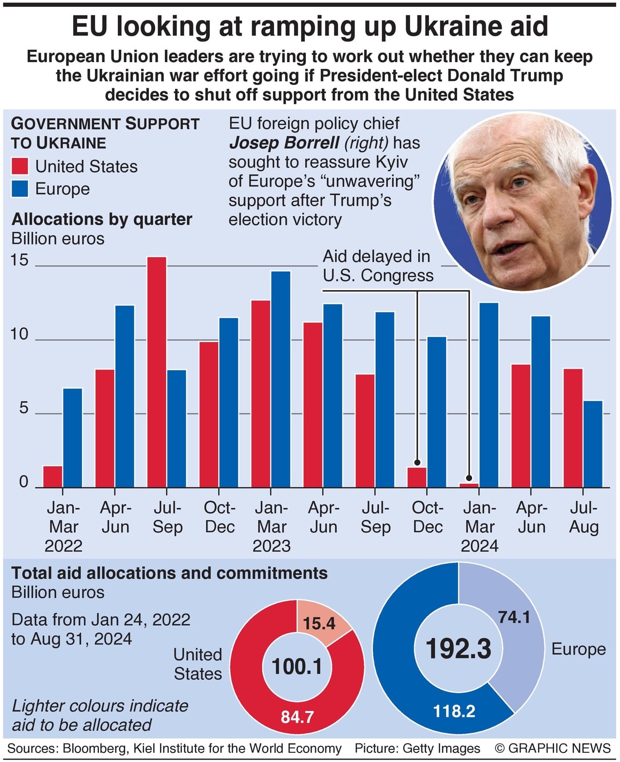The EU has been the biggest provider of aid to Ukraine, allocating €118 billion ($127 billion) since the start of the conflict, according to the Kiel Institute for the World Economy. The U.S. has provided €85 billion in total, although the flow of money has tailed off this year, with just €17 billion allocated.