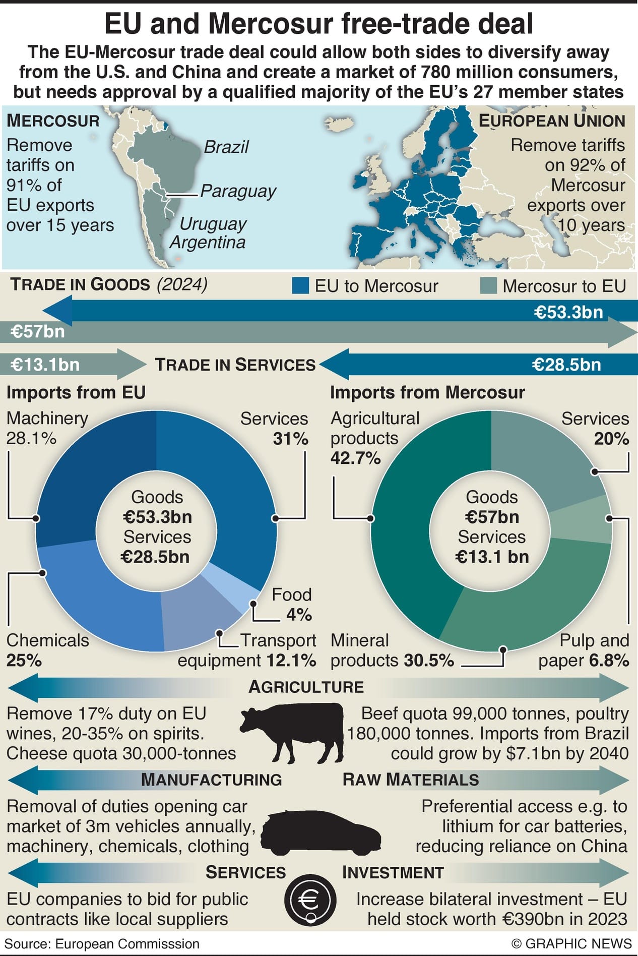 A EU-Mercosur trade deal could allow both sides to diversify away from the U.S. and China and create an integrated market of 780 million consumers but needs approval by the EU’s 27 member states.