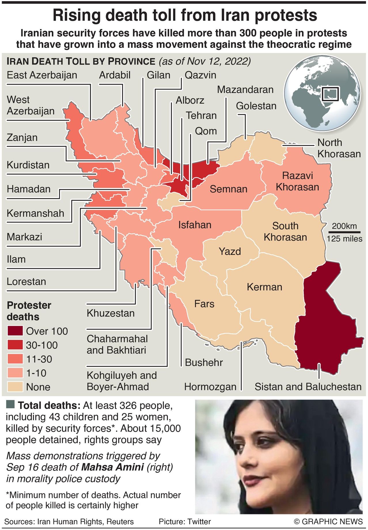 At least 326 demonstrators have been killed in the unrest and about 15,000 detained, according to the activist HRANA news agency.